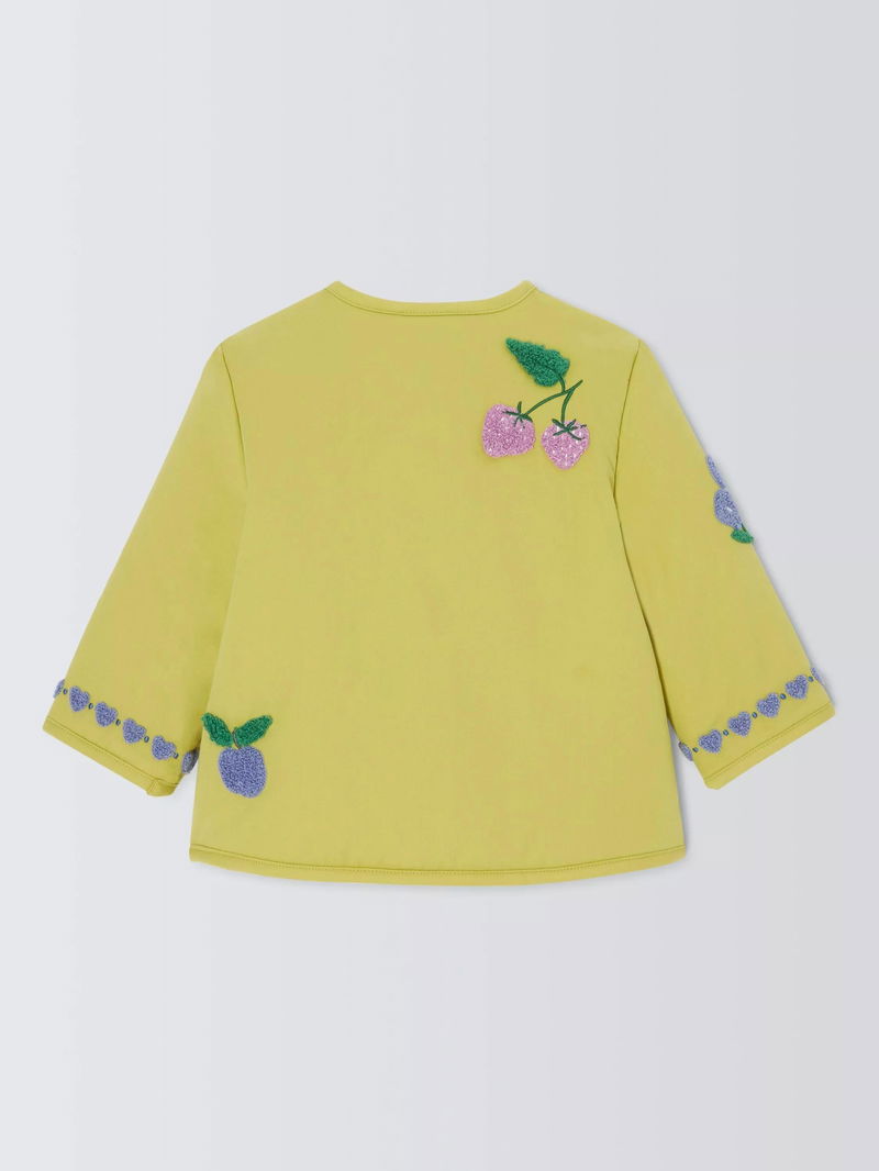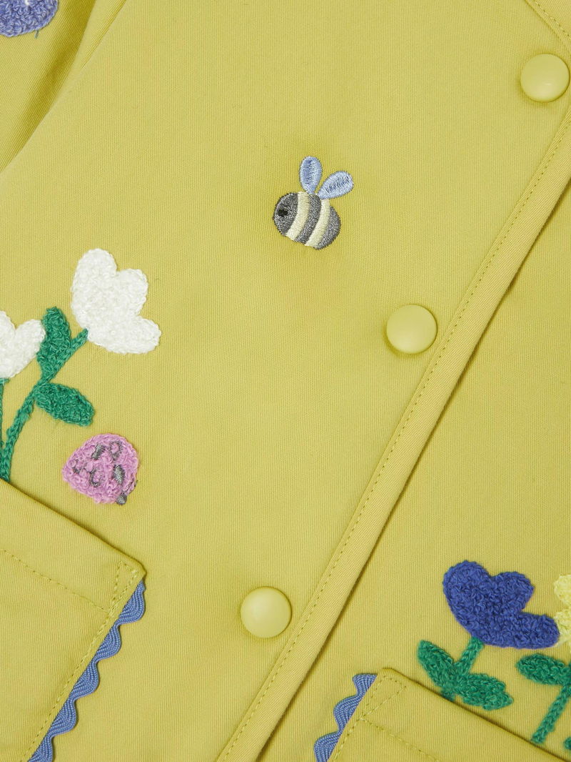 A standout jacket with a peached finish for a supersoft, velvety feel. The body and sleeves are lined with cotton poplin to be gentle against the skin. Poppers down the centre front make for easy on and off. Complete with ric-rac trim detail on the pocket edges, embroidered flowers and hearts, and boucle details.