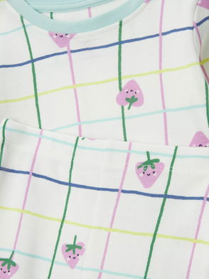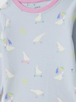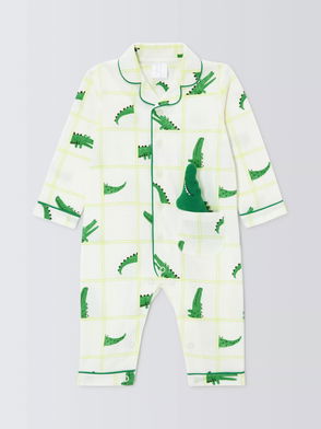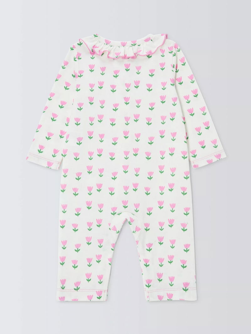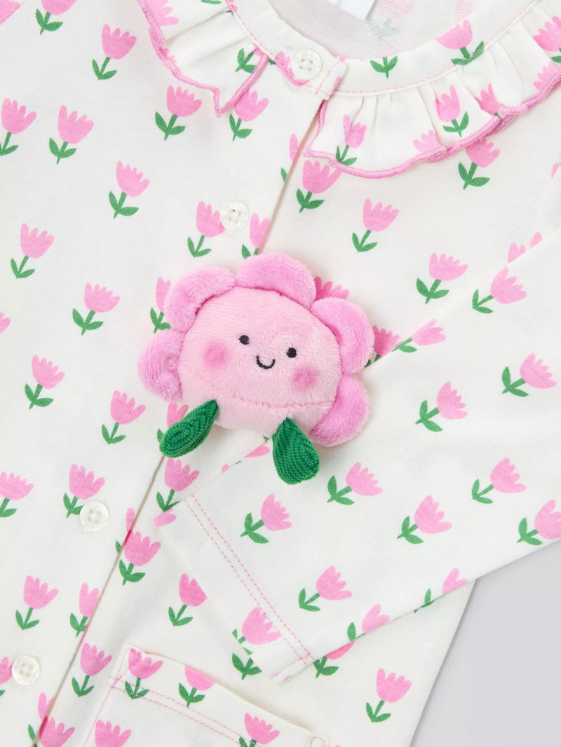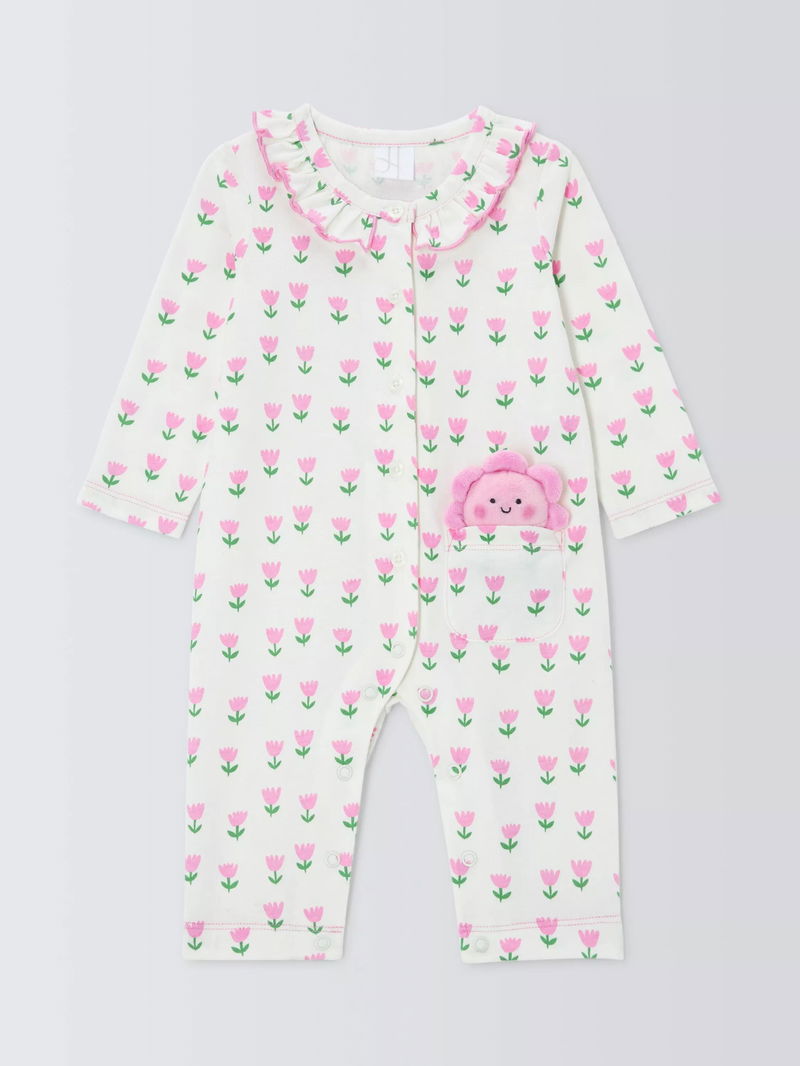A pure cotton, button-up romper with a sweet, frilly collar. Finished with a patch pocket where there's a soft toy companion tucked inside.