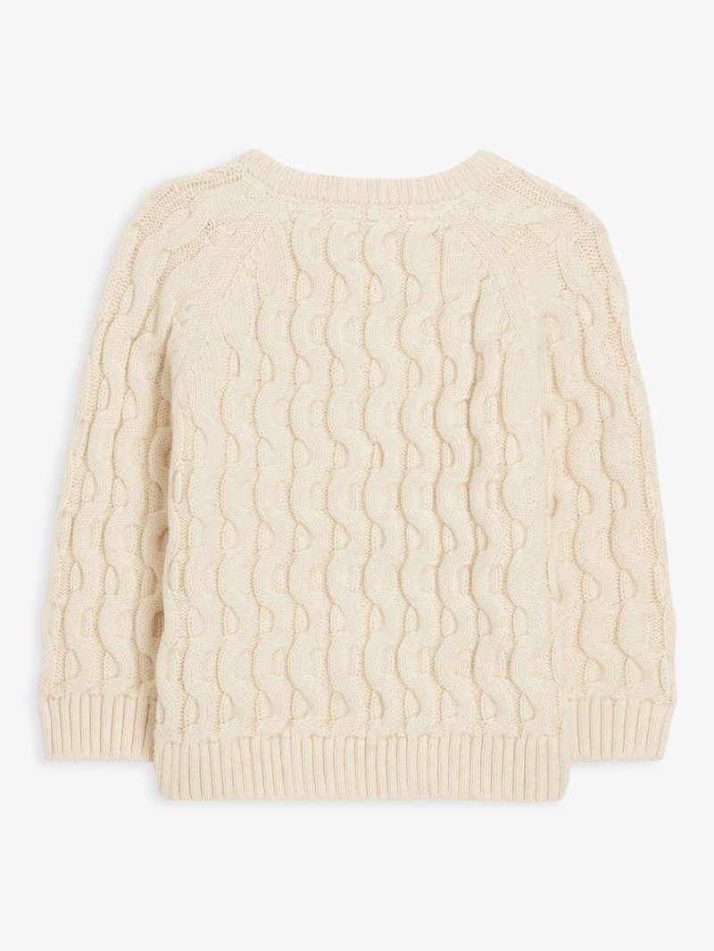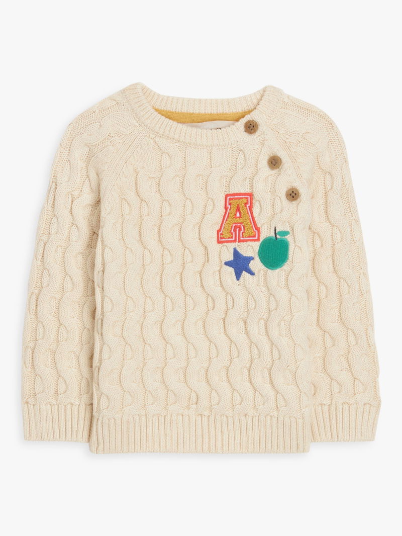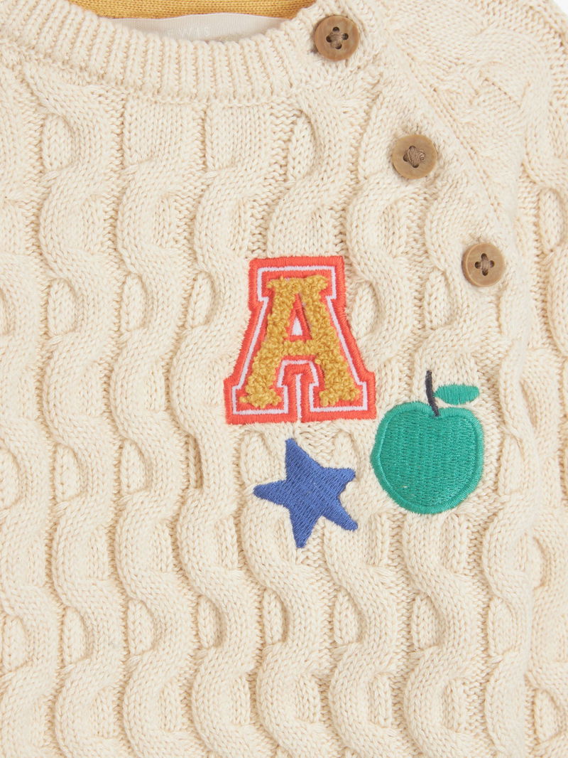 A cute and cosy option for keeping baby warm this winter, this jumper comes in a classic cable knit texture and is finished with cute school design applique on the front for added interest. Three side button fastenings help with easy changing.
