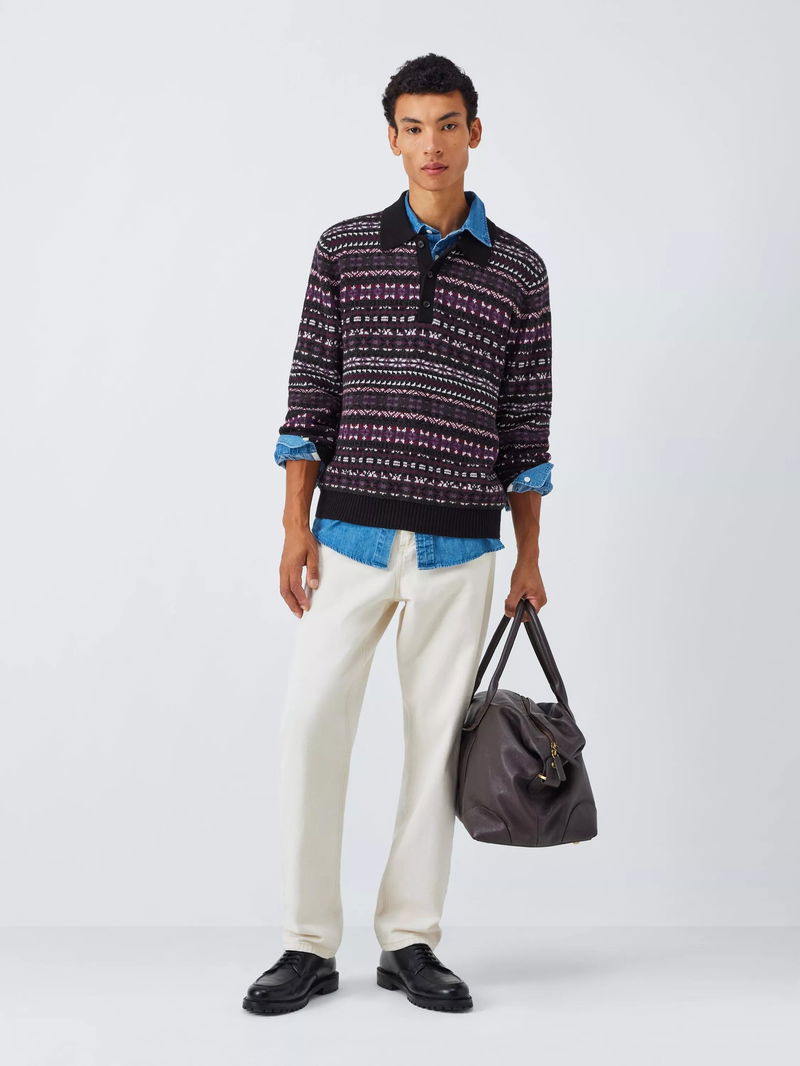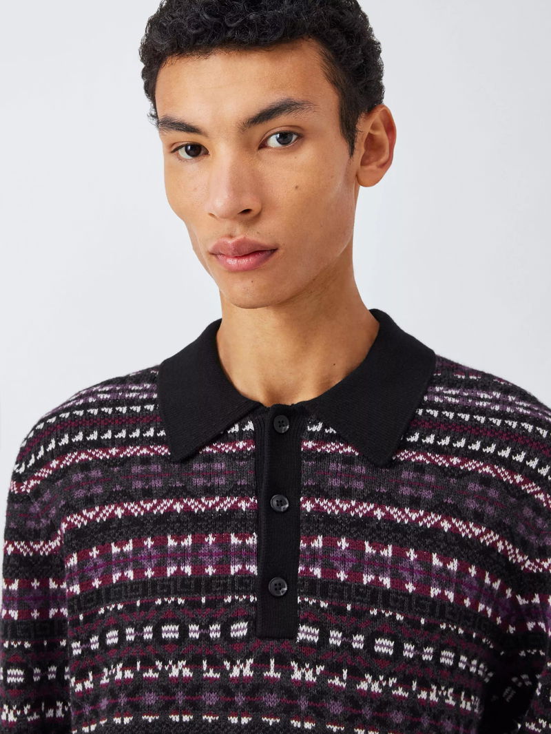 A bold take on a classic, this polo top proves that knitwear doesn't have to be basic. It's a statement piece that champions Modern British style, blending a familiar silhouette with a striking, refreshed Fair Isle pattern that feels both rooted in tradition and current.