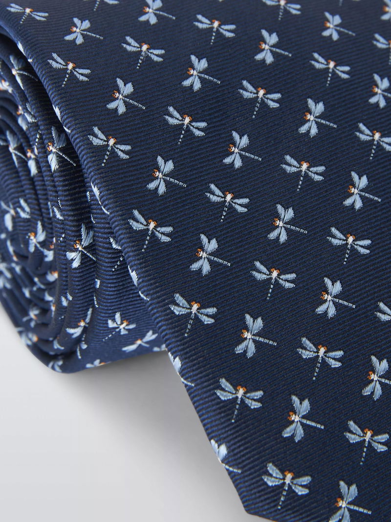 Character meets craftsmanship in this silk tie, where a dragonfly motif brings a playful touch to traditional tailoring. Woven from pure, high-quality silk, it has a luxurious handle and a natural sheen. Designed with a classic blade width, the tie features a substantial interlining that allows for a precise knot and an impeccable drape. For a balanced look, pair it with a pale shirt and a charcoal suit to let the detailed embroidery take centre stage.