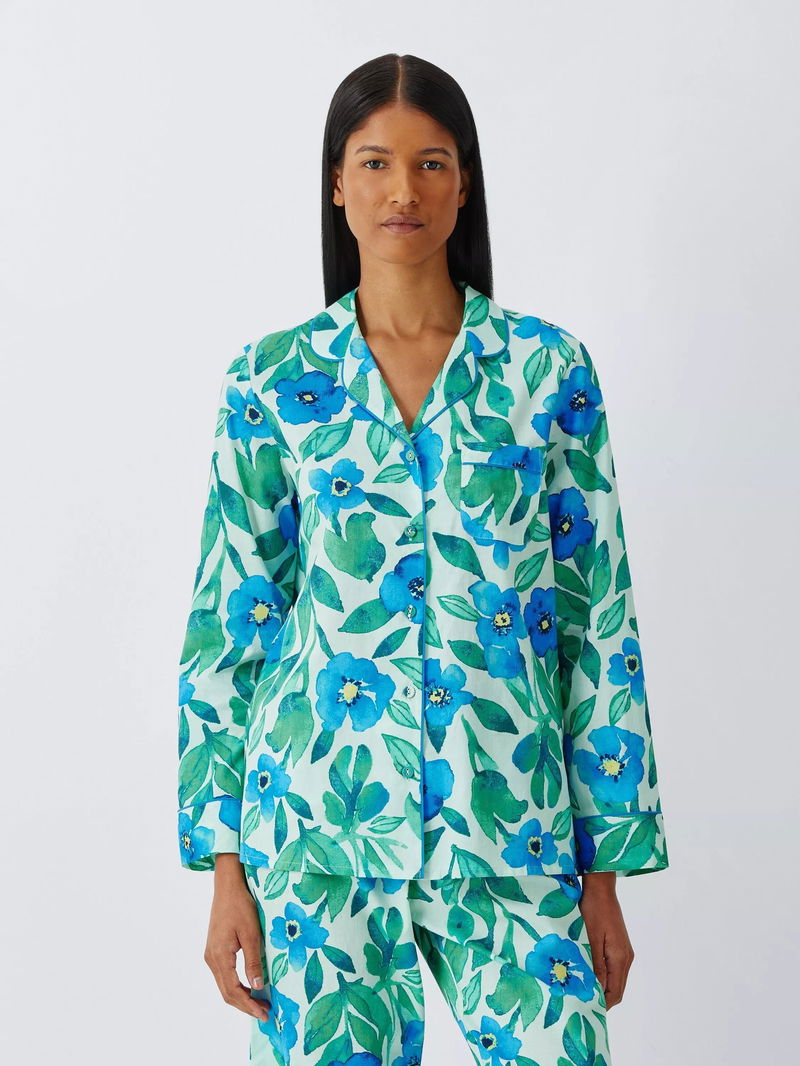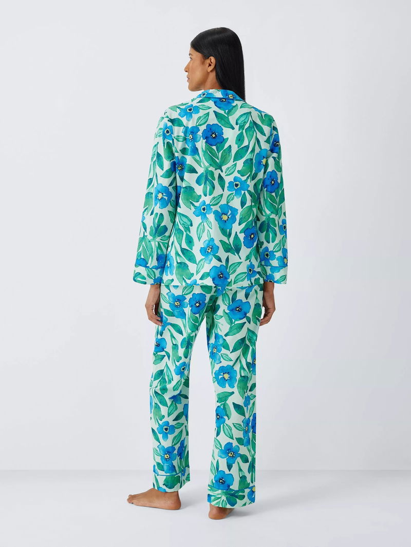 Floral Pure Cotton Button Through Long Pyjama Set, Green