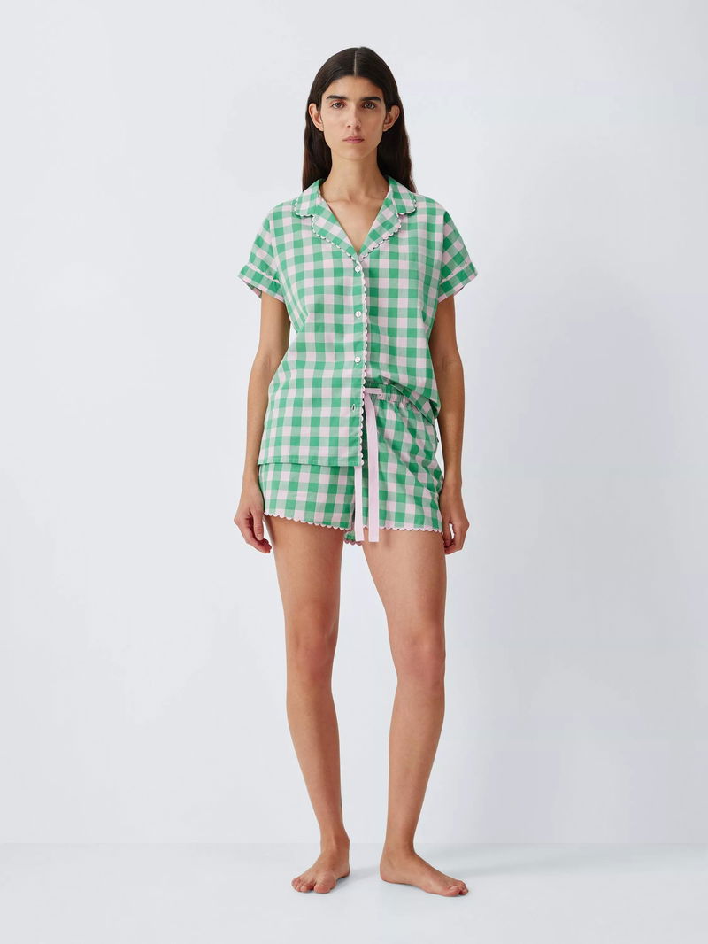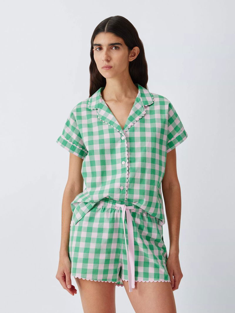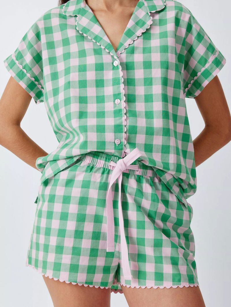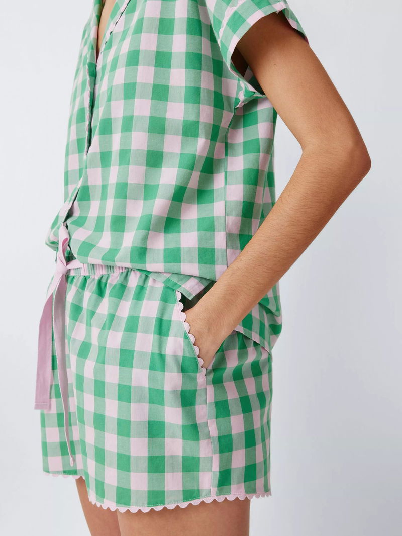 Pure cotton pyjama shorts with all-over gingham print and pretty ric rac trim. A fully elasticated waistband with twill tape drawcord ensure a comfy fit whilst the side pockets are perfect for stashing the essentials.