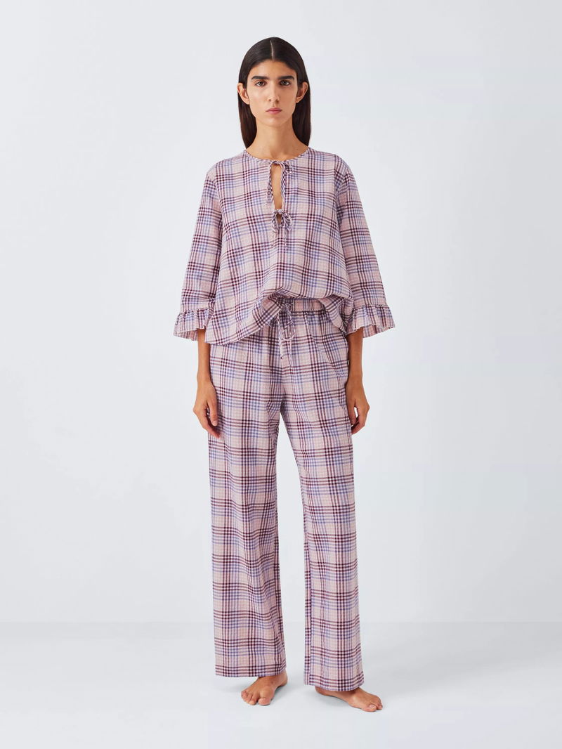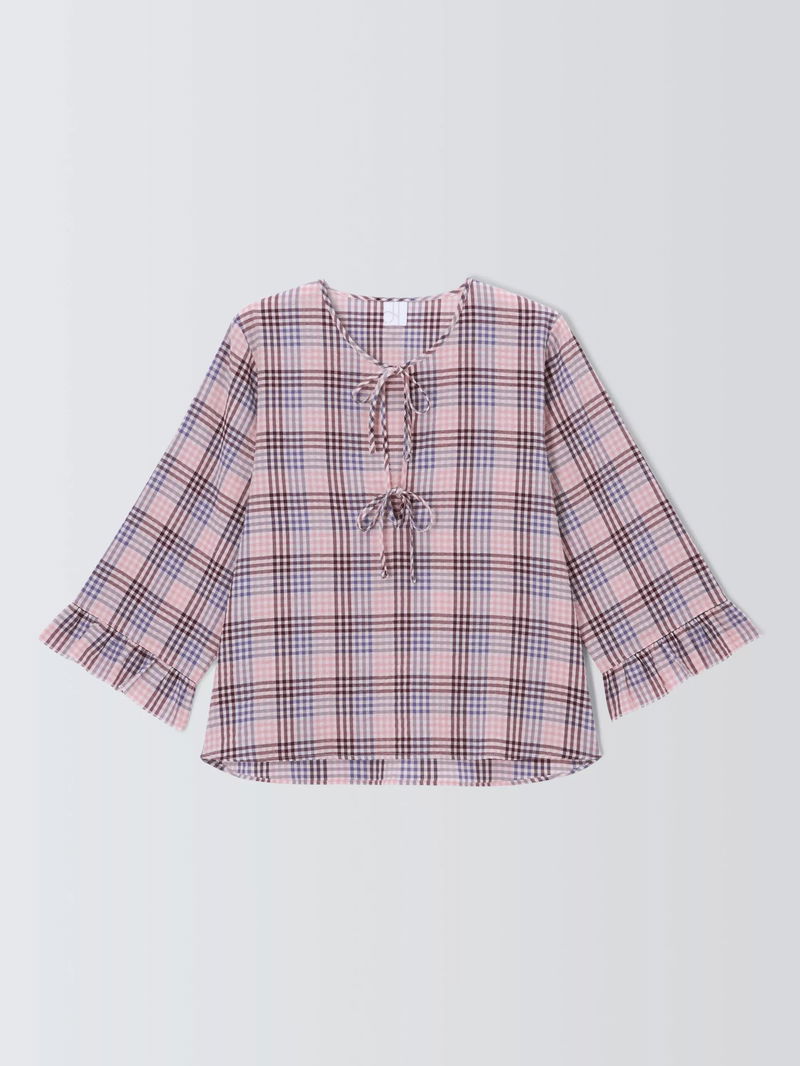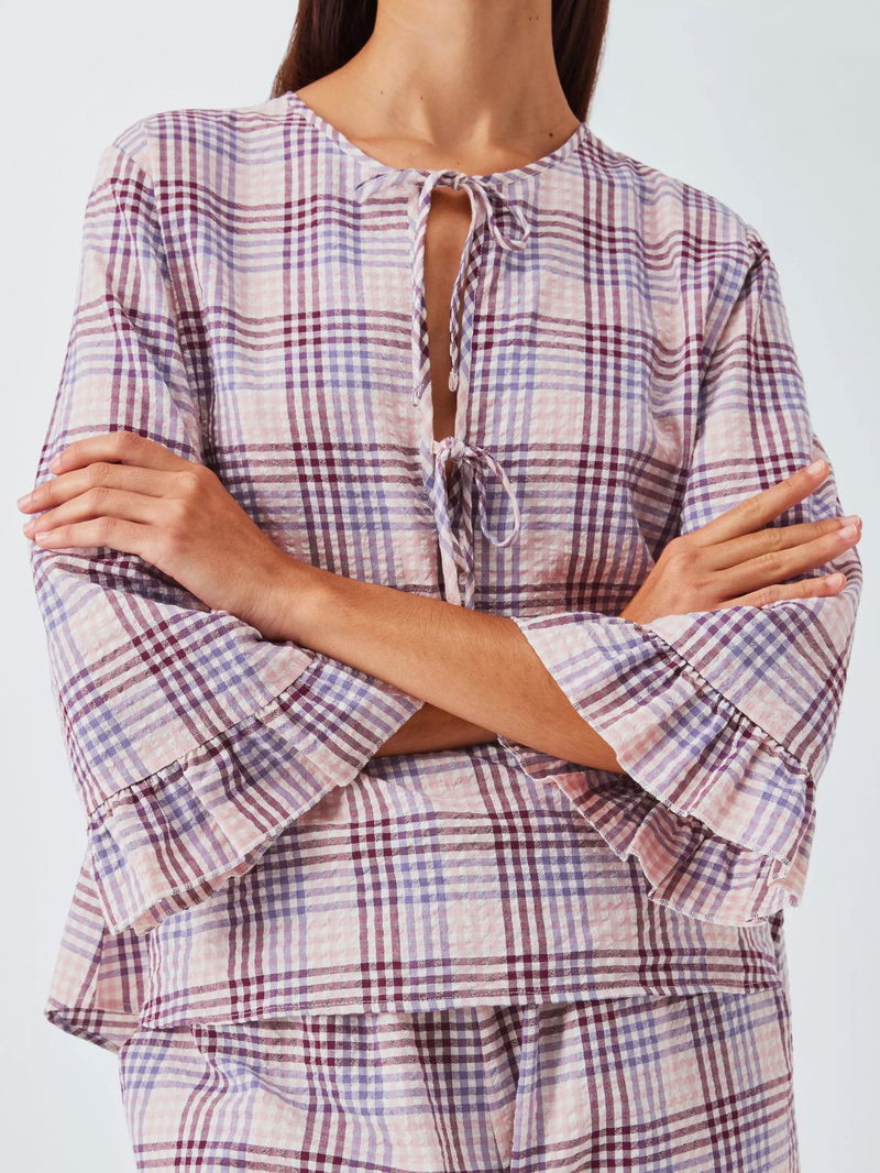 Gingham Tie Front Pyjama Top, Pink/Lilac