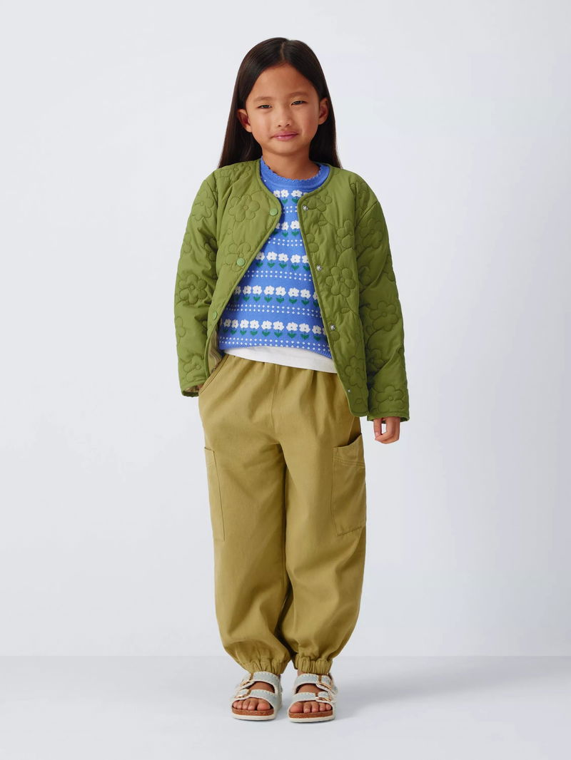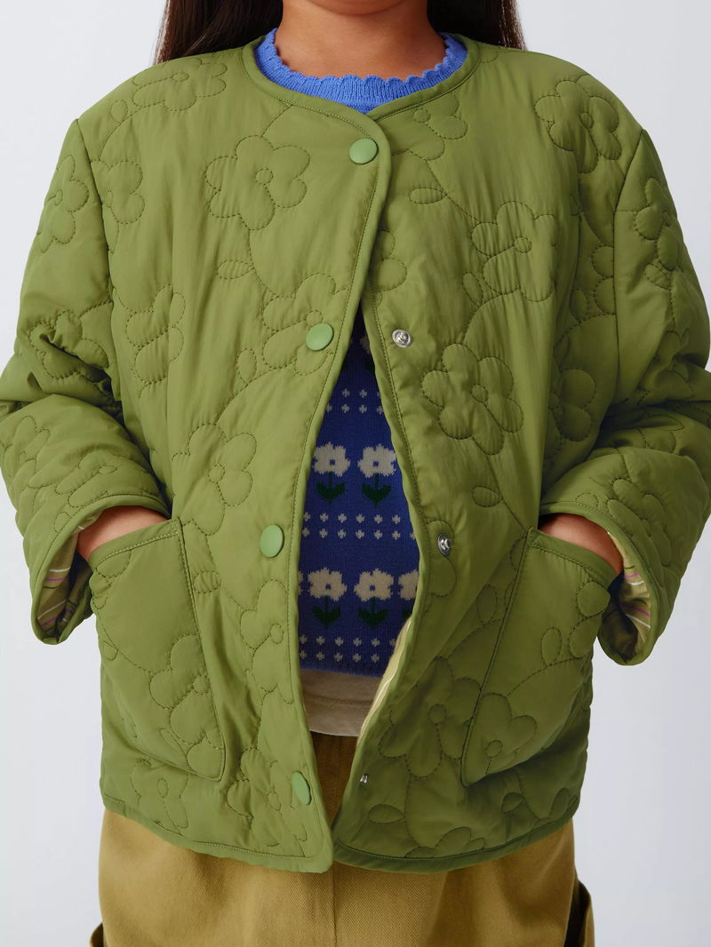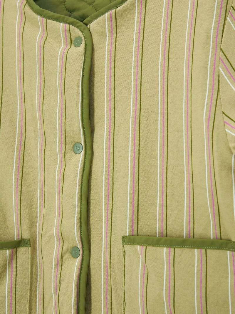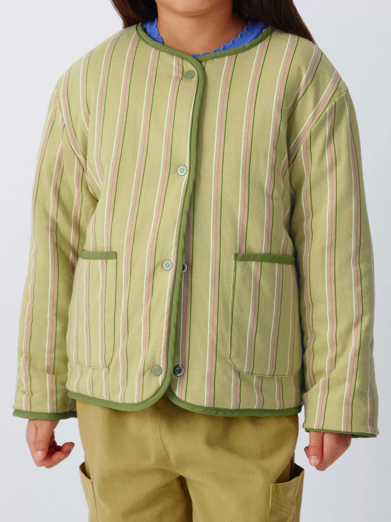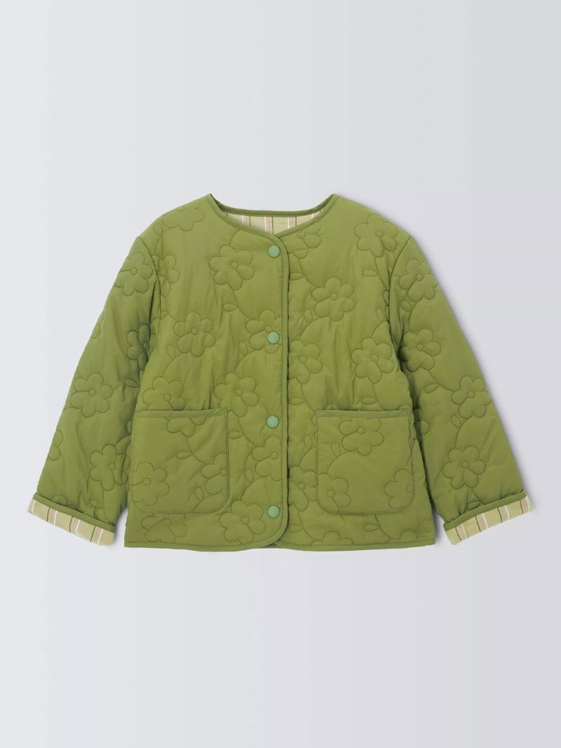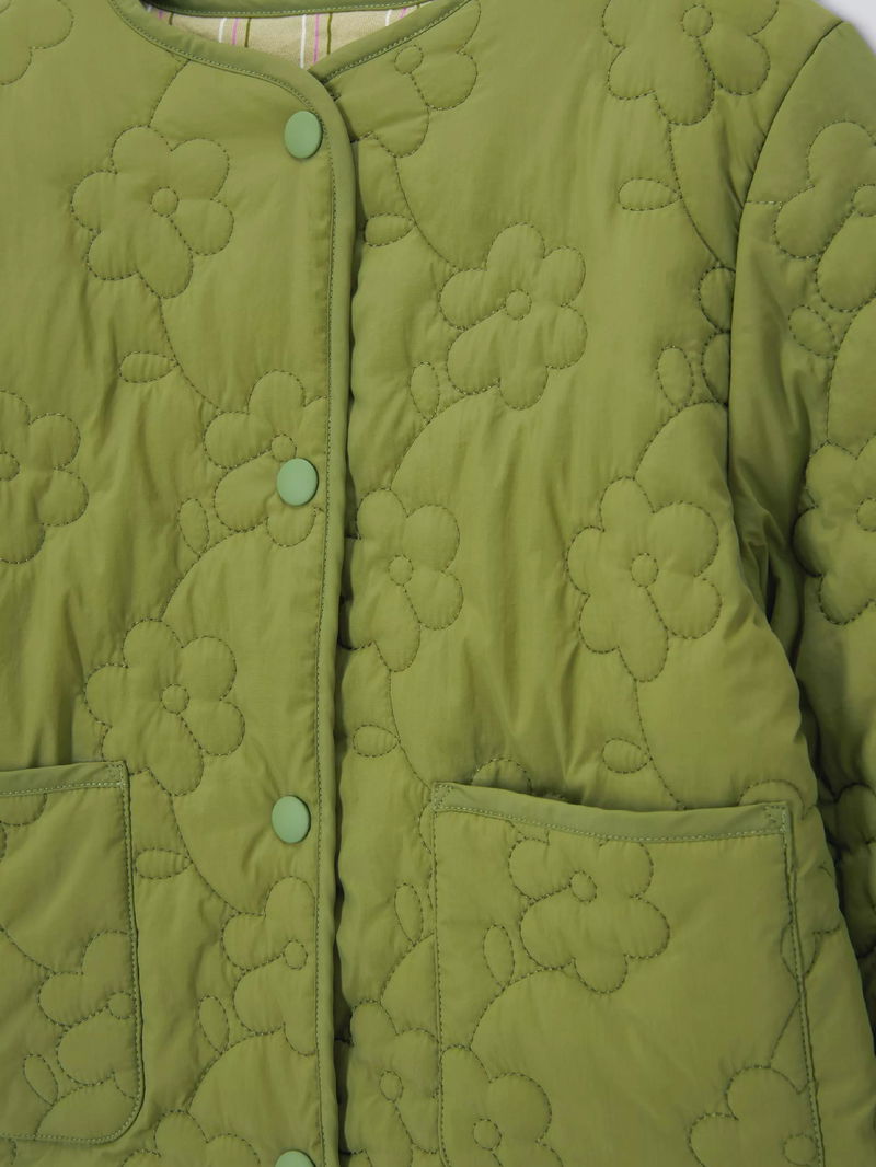 A reversible jacket in a quilted texture. With a shower-resistant outer and flower design, the reverse showcases a cotton stripe print with a silicone finish. Features wading in the body and sleeves, patch pockets, and poppers on the front placket.