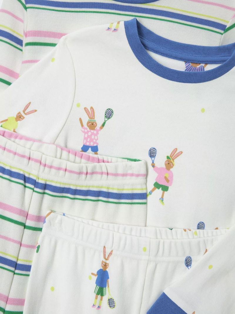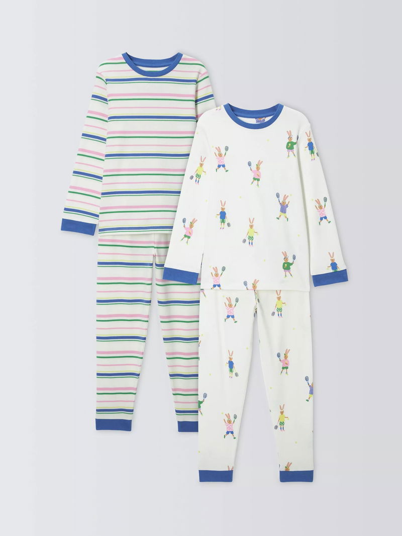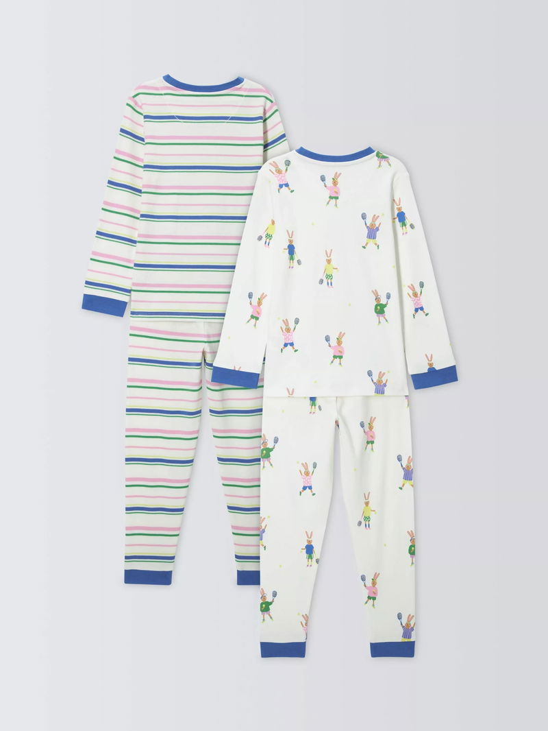 Kids' Tennis Bunnies & Stripes Pyjamas, Pack Of 2, White Multi