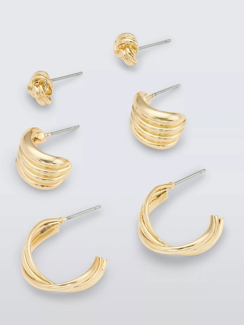 Knot Stud, Twist And Ridged Small Hoop Earrings, Gold, Set Of 3