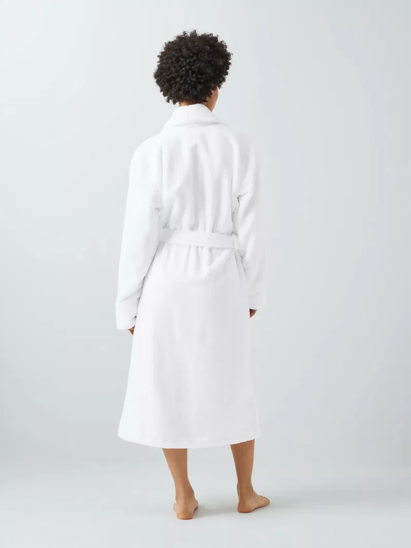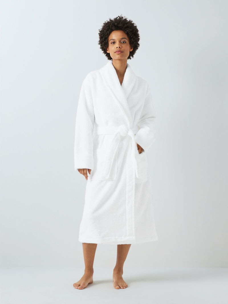 Perfect for when you come out of the bath or simply to cover you up when you enjoy your favourite beauty treatment, this super-soft robe from John Lewis will add the ultimate comfort to your well-being. This cotton rich gown is designed with a clever snag resist technology, helping it to keep its luxurious appearance for longer. A small amount of polyester fibre has been used in the base of the fabric, locking the cotton loops in place. The super soft MicroCotton uses zero twist technology, making this lightweight towelling feel thicker and softer, whilst at the same allowing the towelling gown to be more absorbent and faster drying. The design features a shawl collar, a belt and twin outsize patch pockets. The dressing gown stops just below the knee for added comfort.