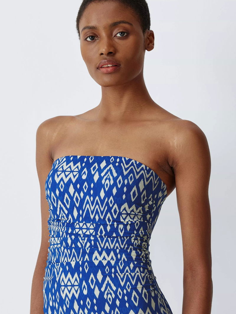 Malay Ikat Rouched Bandeau Swimsuit, Navy Blue