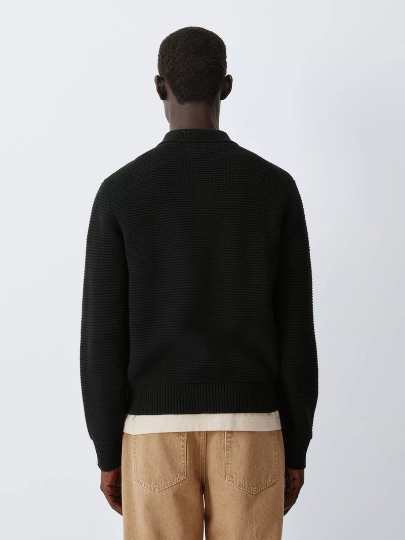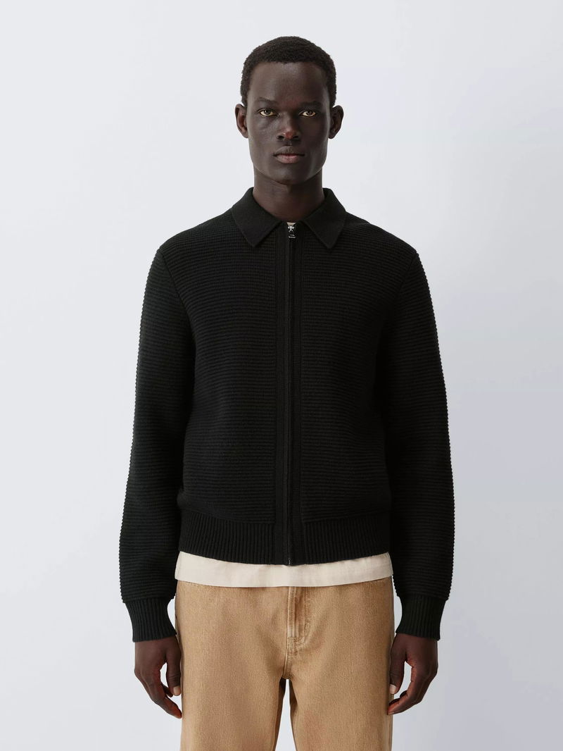 Ottoman Knit Zip Through Jumper With Merino Wool, Black