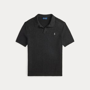 Long-sleeved polo shirt with a revere-style open collar. Made of a ribbed cotton knit with a contrasting ribbed collar, cuffs and hem. Great for smart-casual styling.