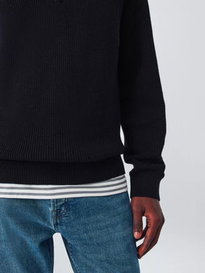 A soft cotton knit jumper in a subtly textured seed stitch. Completed with ribbed cuffs, hem and high neckline. The half-zip neckline makes it a versatile piece that's easy to style and great for light layering.