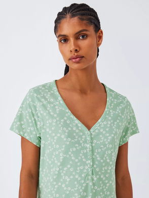 A seersucker cotton nightdress with a square neck at the front and back, cap sleeves, and shell buttons.