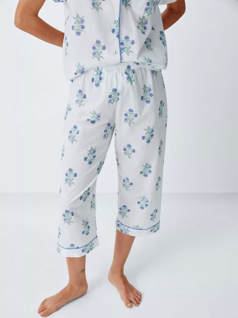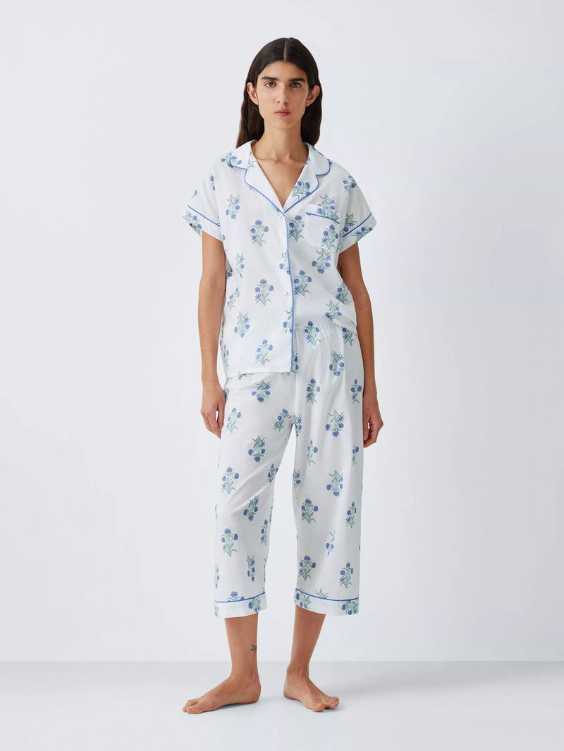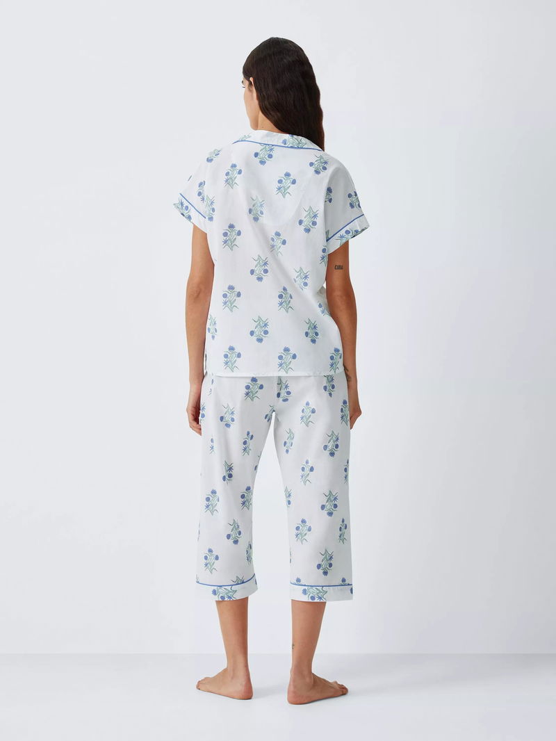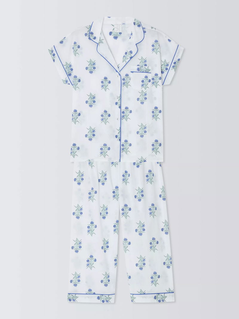 Stamped Floral Pure Cotton Button Through Cropped Pyjama Set, White