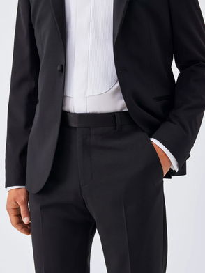 Sharkskin wool suit trousers tailored to our regular fit specification. A straight leg with front pleats, finished with AMF stitching and double jet back pockets with a button fastening. They fasten at the waist with a zip, internal jigger and hook-and-bar closure. The 4cm deep waistband has a 5.5cm rounded waistband extension with a button fastening. Team with the matching suit blazer.