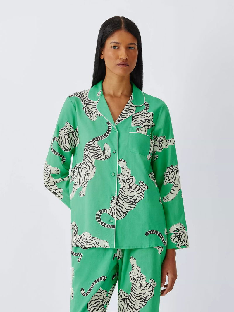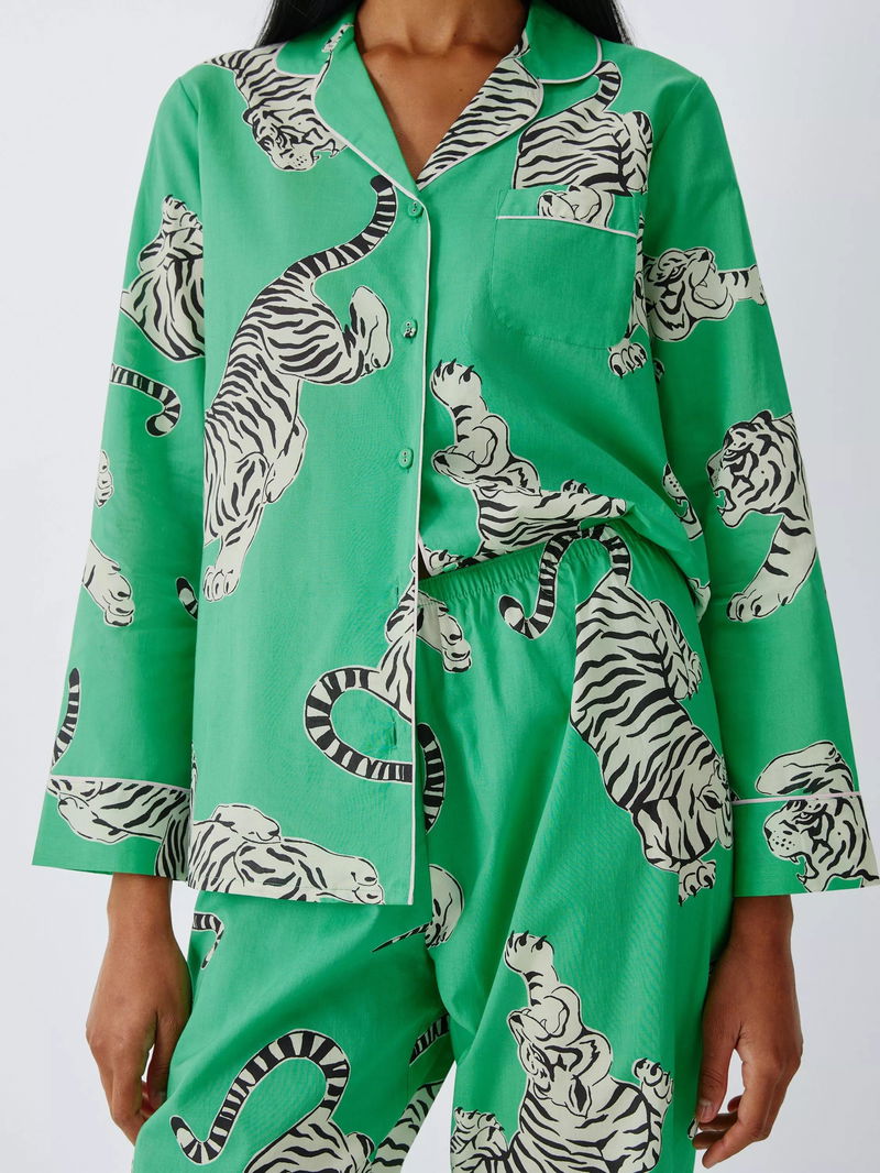 Tigers Button Through Long Pyjama Set, Green