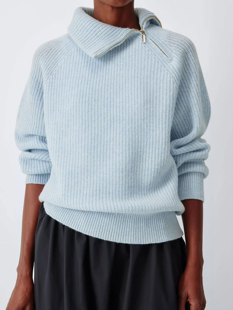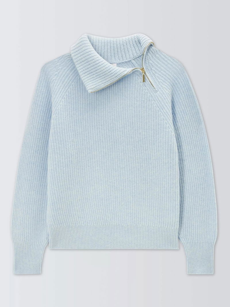 Wool Blend Asymmetrical Zip Neck Jumper, Pale Blue
