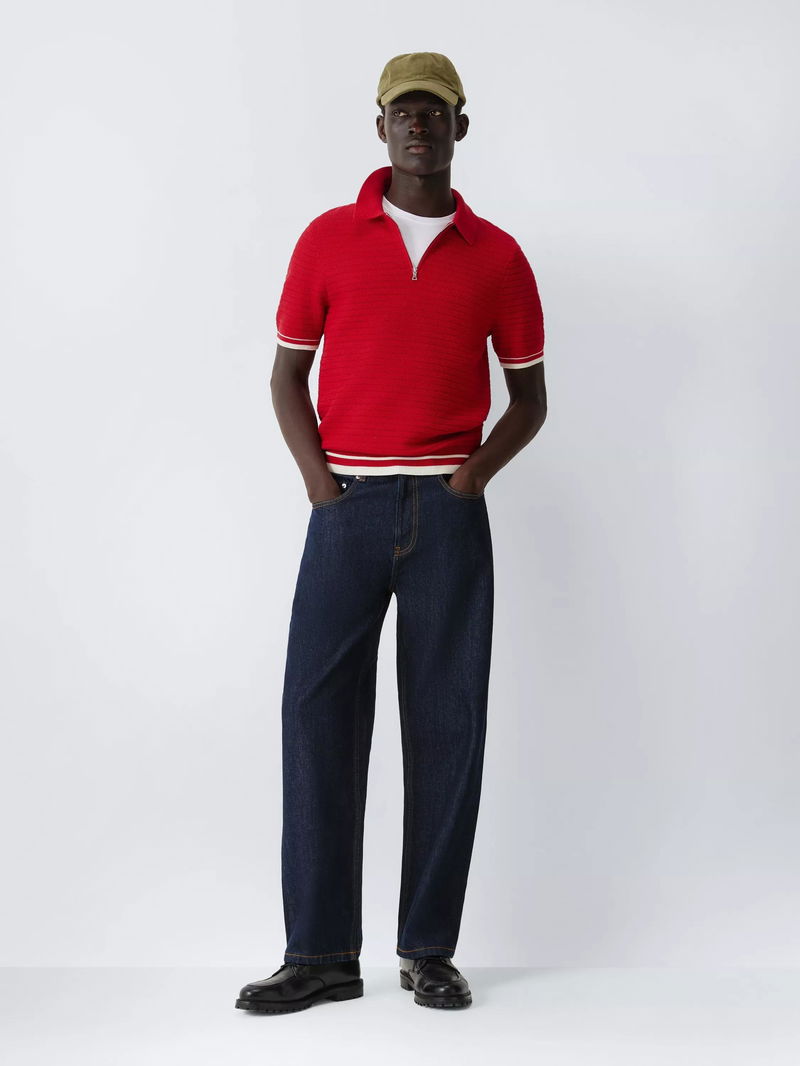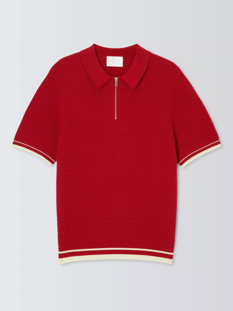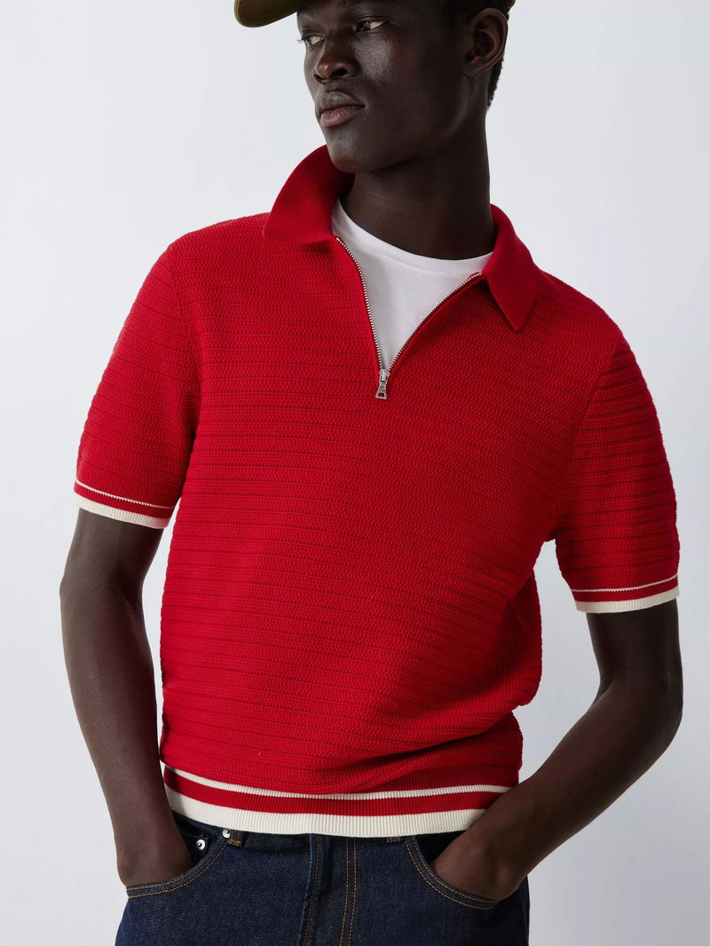 Zip Neck Short Sleeve Textured Cotton Knit Polo Shirt, Red
