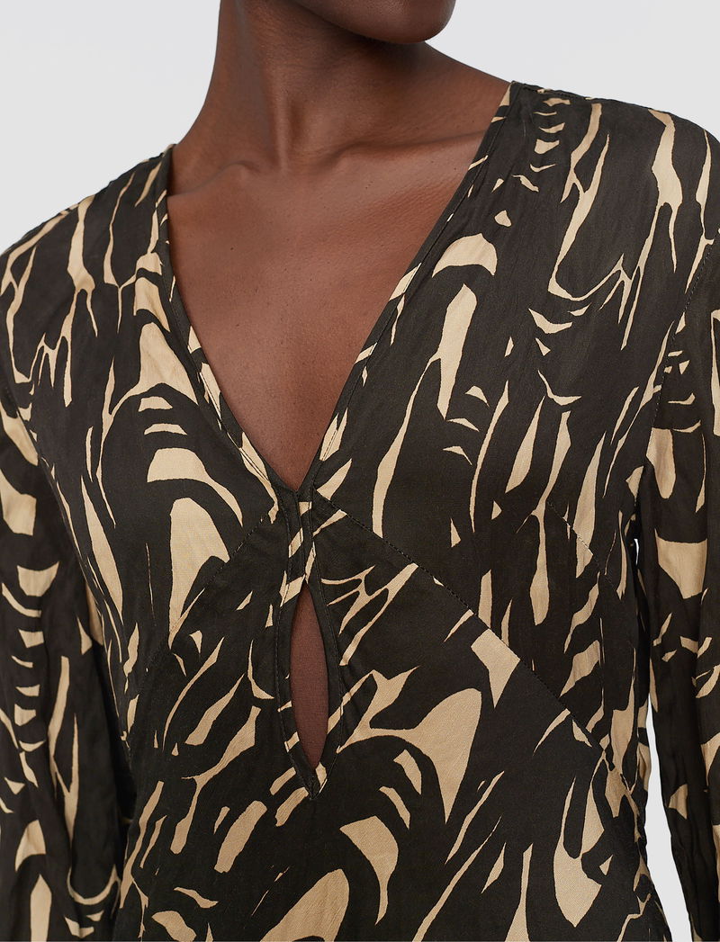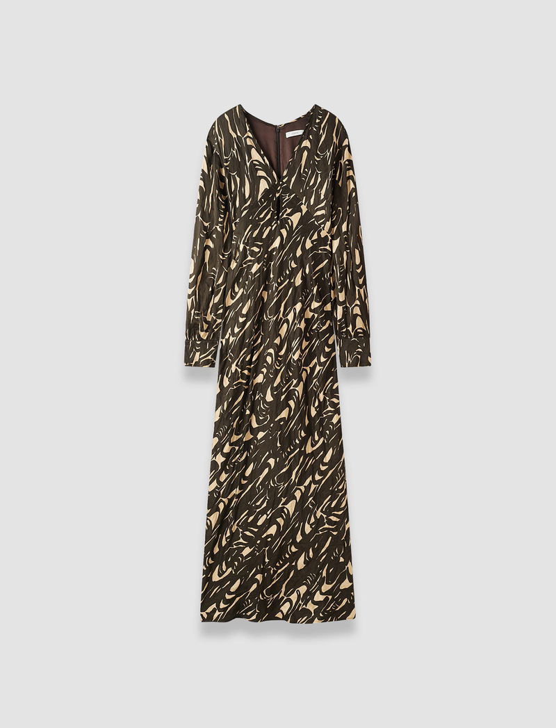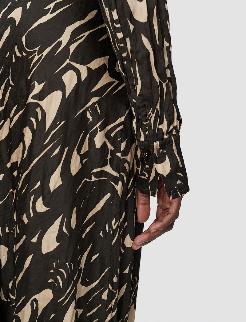 The Adore Printed Crinkle Dress is a floor-length, fit-to-flare silhouette with long cuffed sleeves. Crafted from a blend of metal and viscose fibres, the fabric has a distinctive crinkled texture that provides subtle structure. Exuding effortless elegance, the dress is adorned with an exclusive ribbon print inspired by the Moroccan skyline.