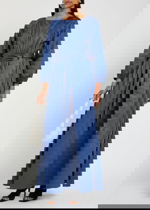 Bellan cotton sateen dress. Full-length. Balloon sleeves. Open neckline. Elasticated gathered waist. Wide tie belt.