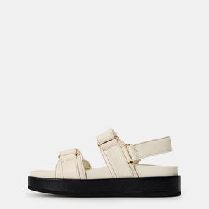 Buffed leather slip-on sandals in off-white. · Straps with knotted detailing at vamp· Padded footbed· Stitching at welt· Treaded foam rubber sole in tan· Contrast stitching in white.
