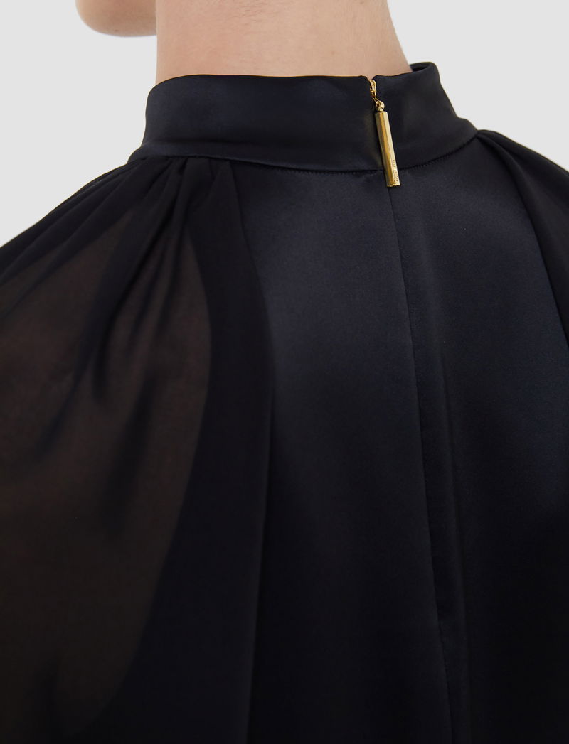 The Cave Double Satin Blouse is a relaxed fit, high neck style, crafted from a responsibly sourced acetate blend known for its lustrous, silky hand feel. This design features sheer, voluminous sleeves for soft, refined elegance. Rich in colour and fluid in movement, it’s an effortless choice for eveningwear or festive occasions.