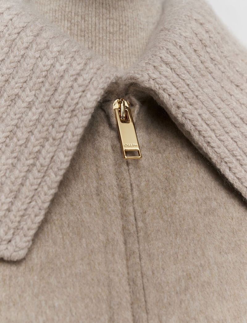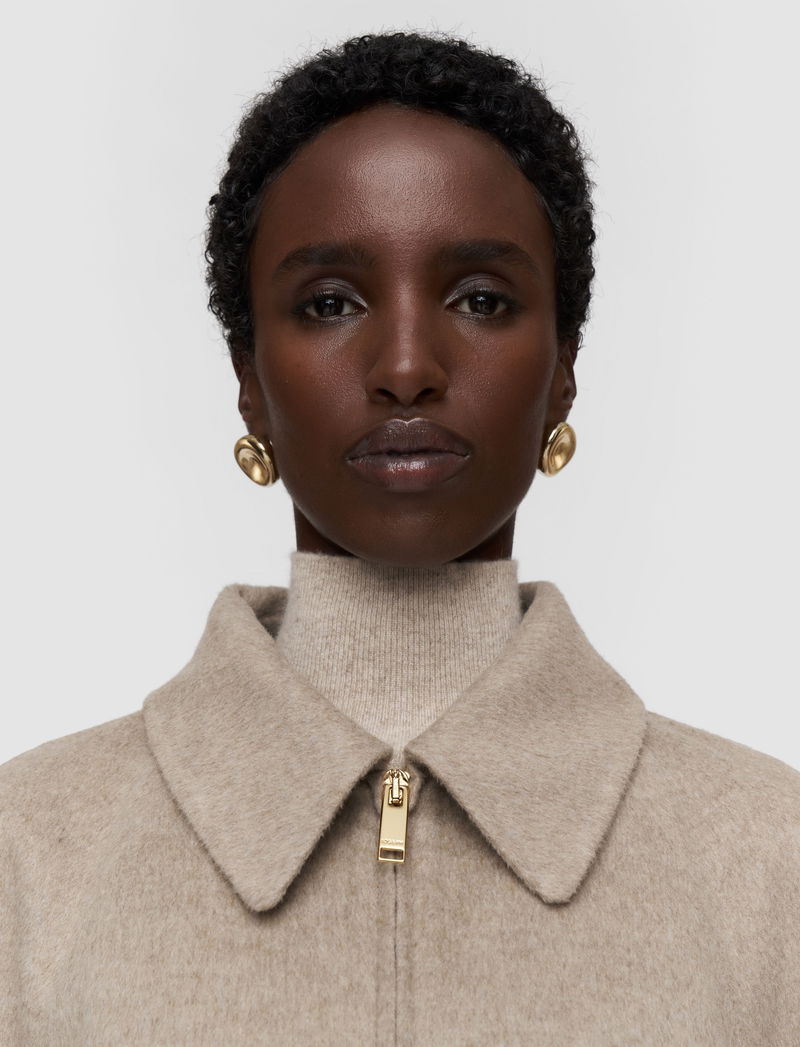 This modern silhouette features soft, sculptural shaping across the back and sleeves. Elegantly finished with a double-ended zip and a detachable knitted collar for versatile styling.