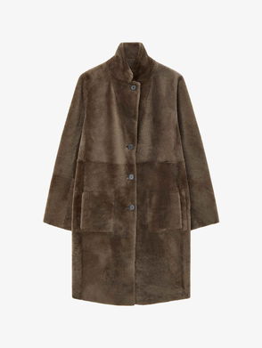 Reversible shearling coat. Reverse in beige buffed lambskin.· Relaxed-fit· Two-way zip closure· Patch pockets· Vented side seams · Welt pockets at interior.