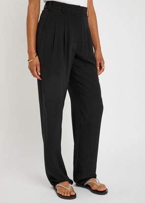 Cut entirely from crepe de soie silk for a fluid alternative to traditional structured styles, they fall in a wide-leg silhouette with sharp front-pressed pleats.