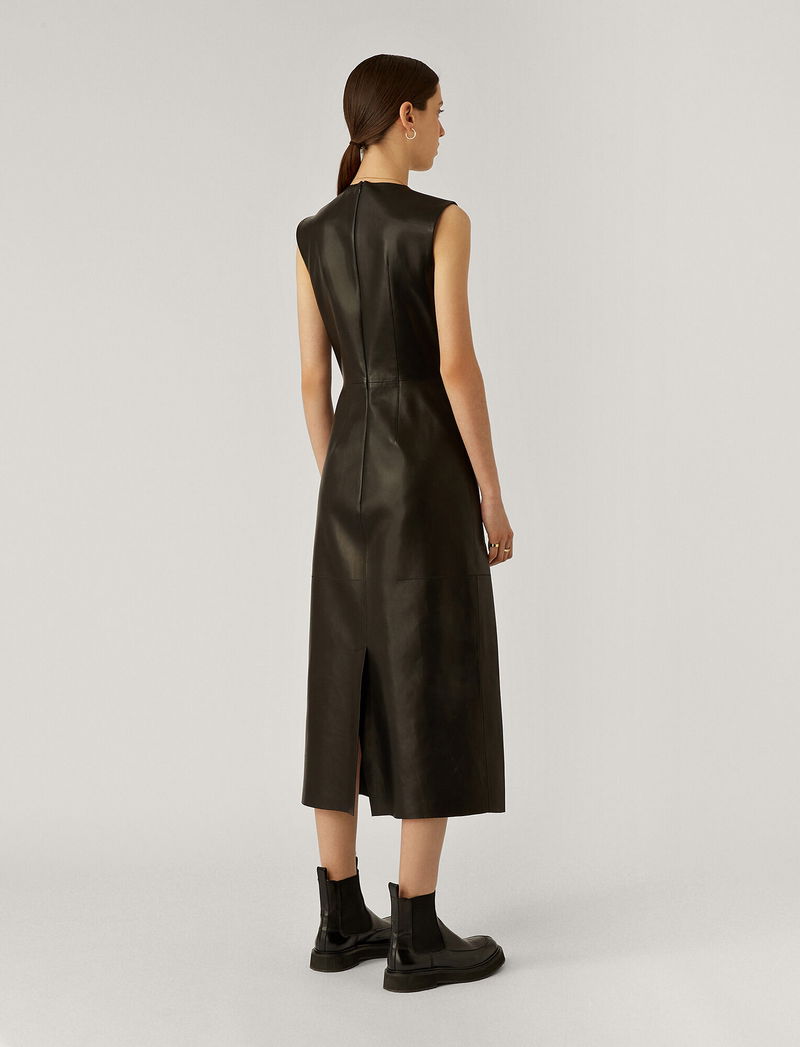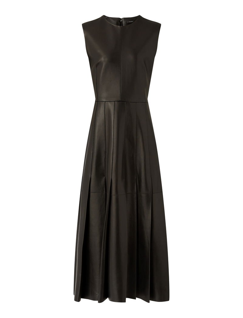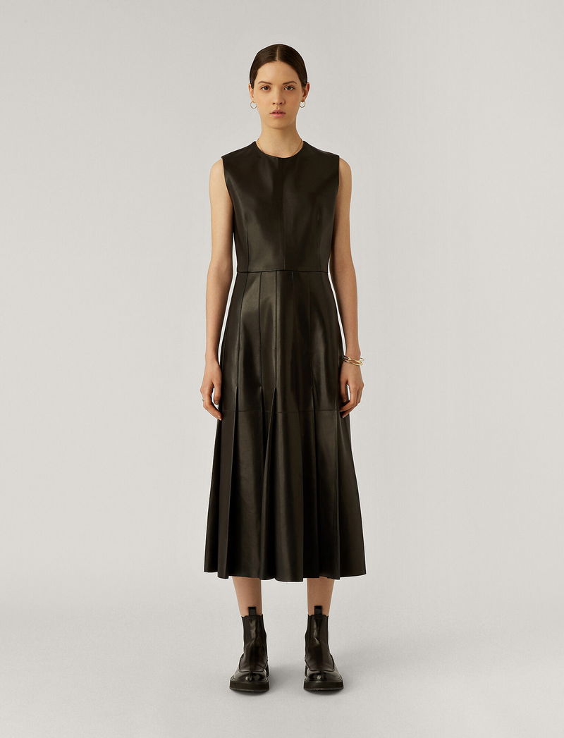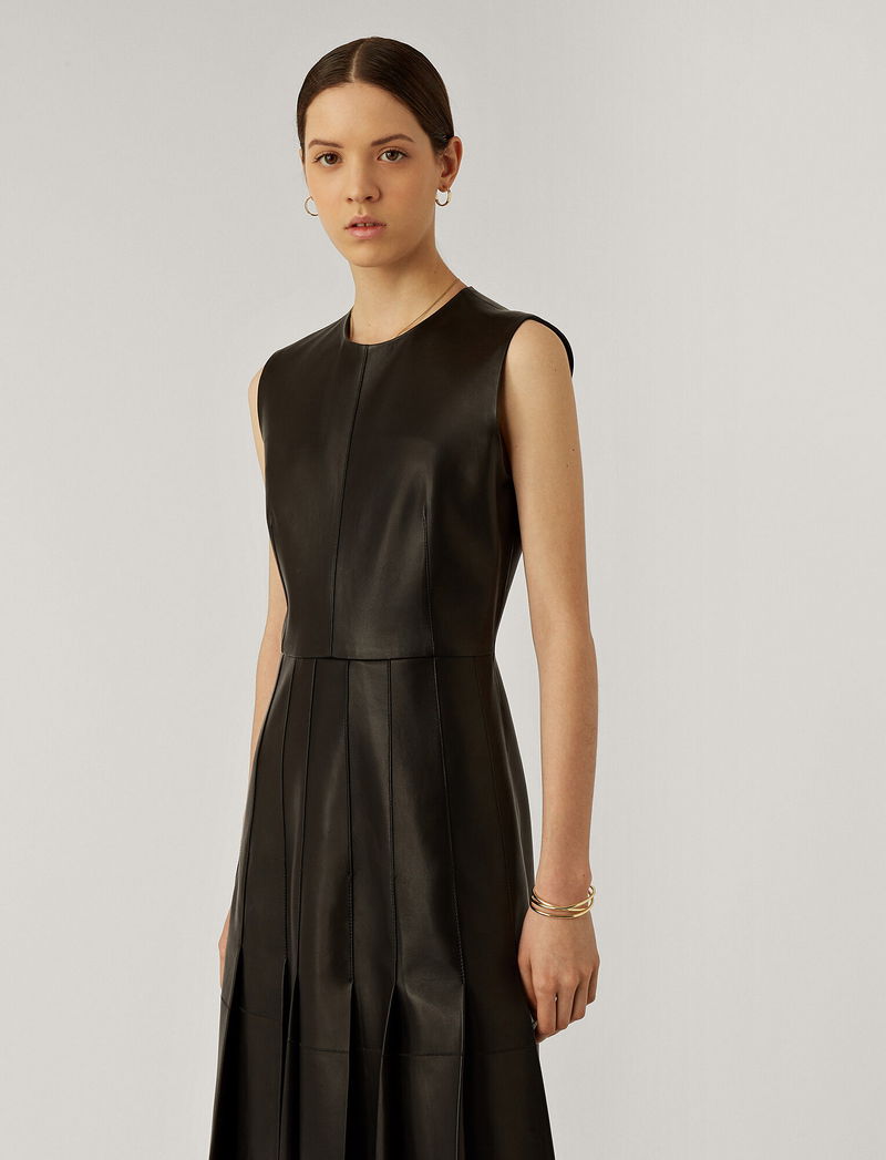 Contemporary yet feminine, the Demry Nappa Leather Dress is a timeless pleated dress crafted from soft lambskin nappa. Falling below the knee, this sleeveless shape is fitted through the body and slightly A Line. Wear under a tailored coat or jacket to achieve effortless style.