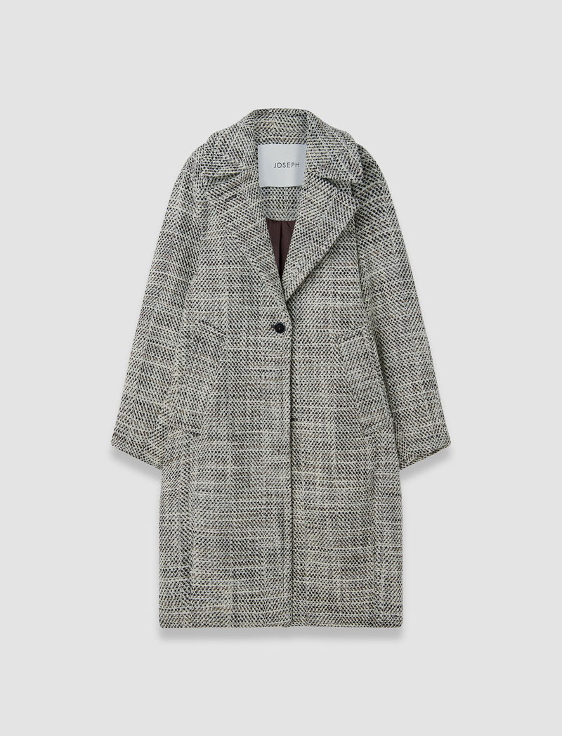 The Florent Crosshatch Virgin Wool Coat is an oversized, mid-length style. It’s crafted from virgin wool in an interlacing weave that adds texture, depth, and structure. Saddle shoulder construction and shaped sleeves create a cocooned silhouette. The versatile collar fastens into a cosy, high-neck for added warmth and coverage.