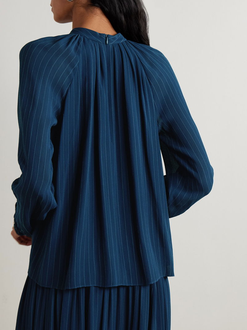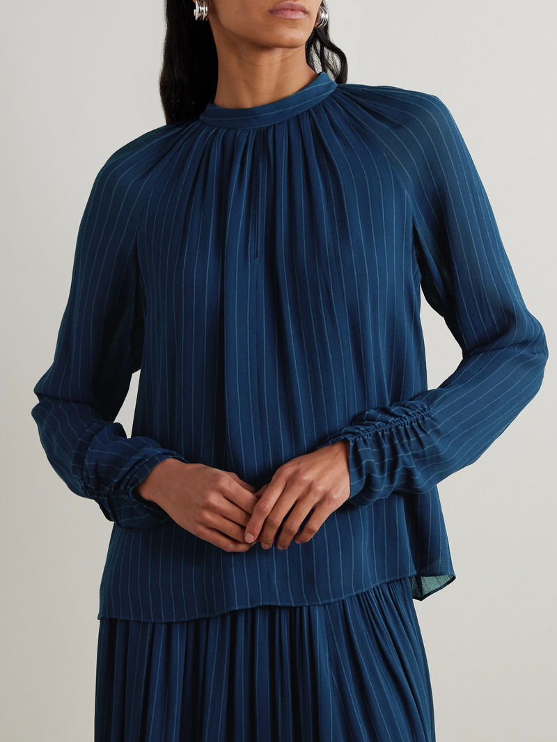 Joseph's 'Garcia' blouse is cut from crepe patterned with subtle laddered pinstripes. It has a stand collar, keyhole slit and is lined just through the body, so the sleeves are slightly sheer.