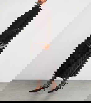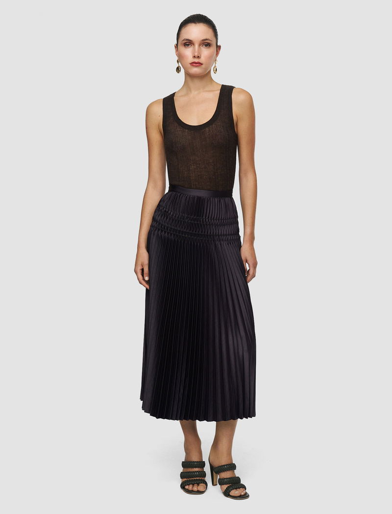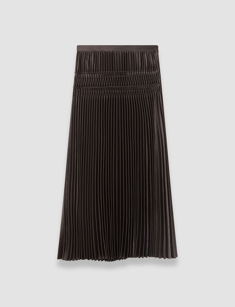 The Hayes Pleated Woven Skirt is a pleated midi style, crafted from a smooth, silk-like fabric. Defined by decorative hand-stitched smocking at the waist, creating a flattering silhouette that drapes with ease.