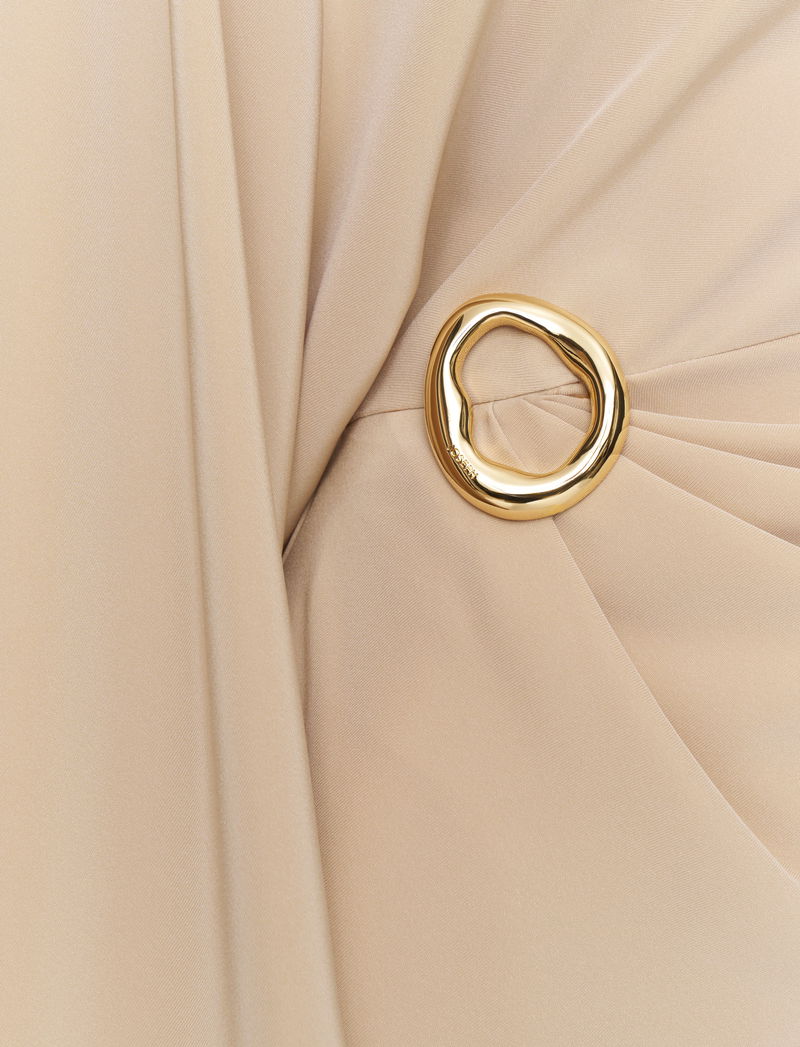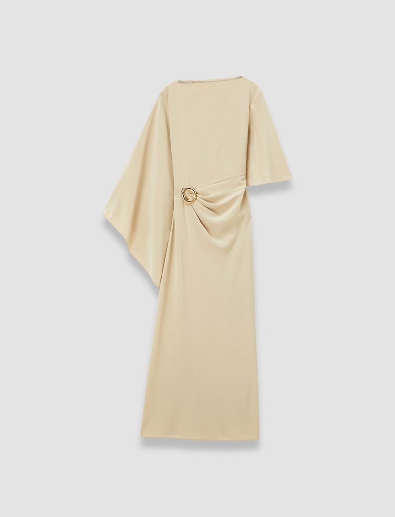 The Joya Satin Twill Dress is a fit to flare silhouette, crafted from a smooth viscose-blend fabric. Soft pleating and draped detailing, secured with a waistline pin, enhance the figure. A slash neckline and asymmetric sleeves complete the look with understated elegance.