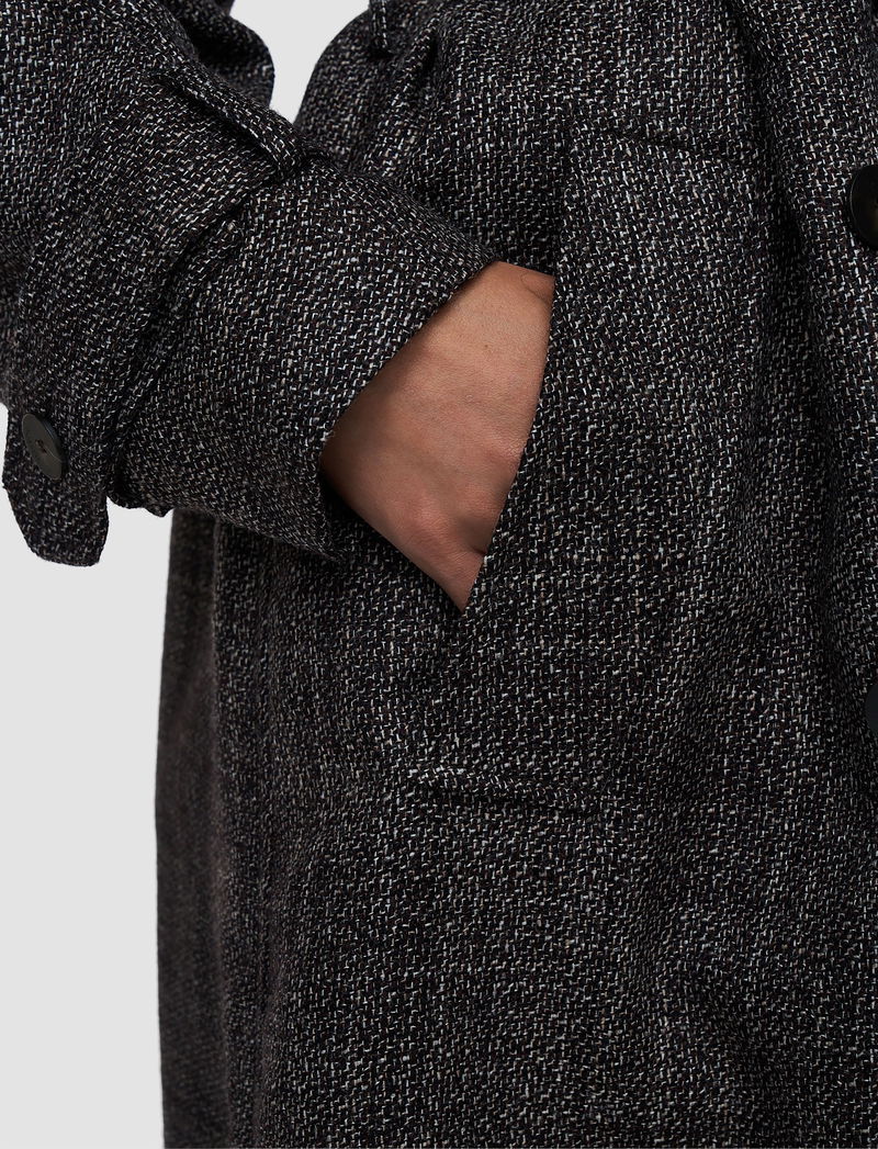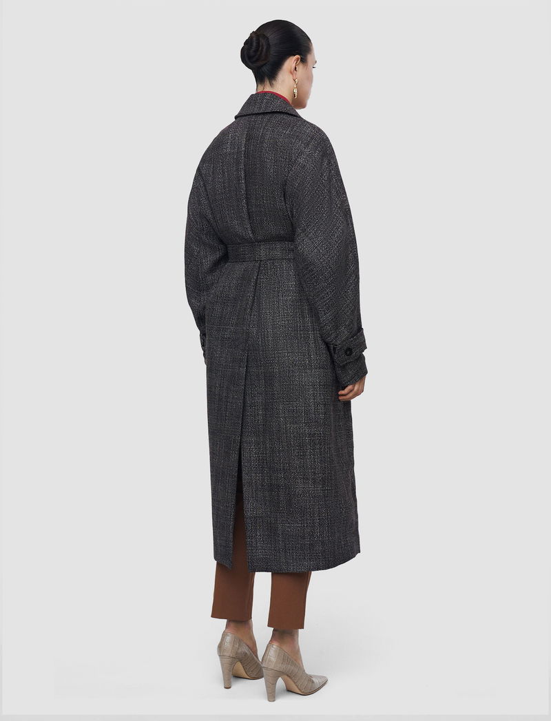The Laurin Textured Tailoring Wool Coat is a relaxed fit trench coat, crafted from virgin wool. This style features a wide collar and sculpted raglan sleeves with cuff tabs, offering definition and elegant proportions. Its woven texture provides subtle structure and a timeless, classic character.