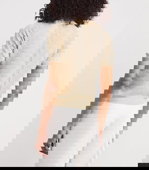 JOSEPH knitted top. Regular fit, round-neck, short sleeves, pointelle detailing, semi-sheer finish, metallic thread.