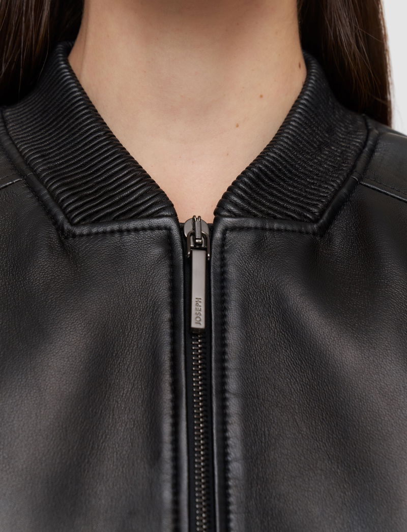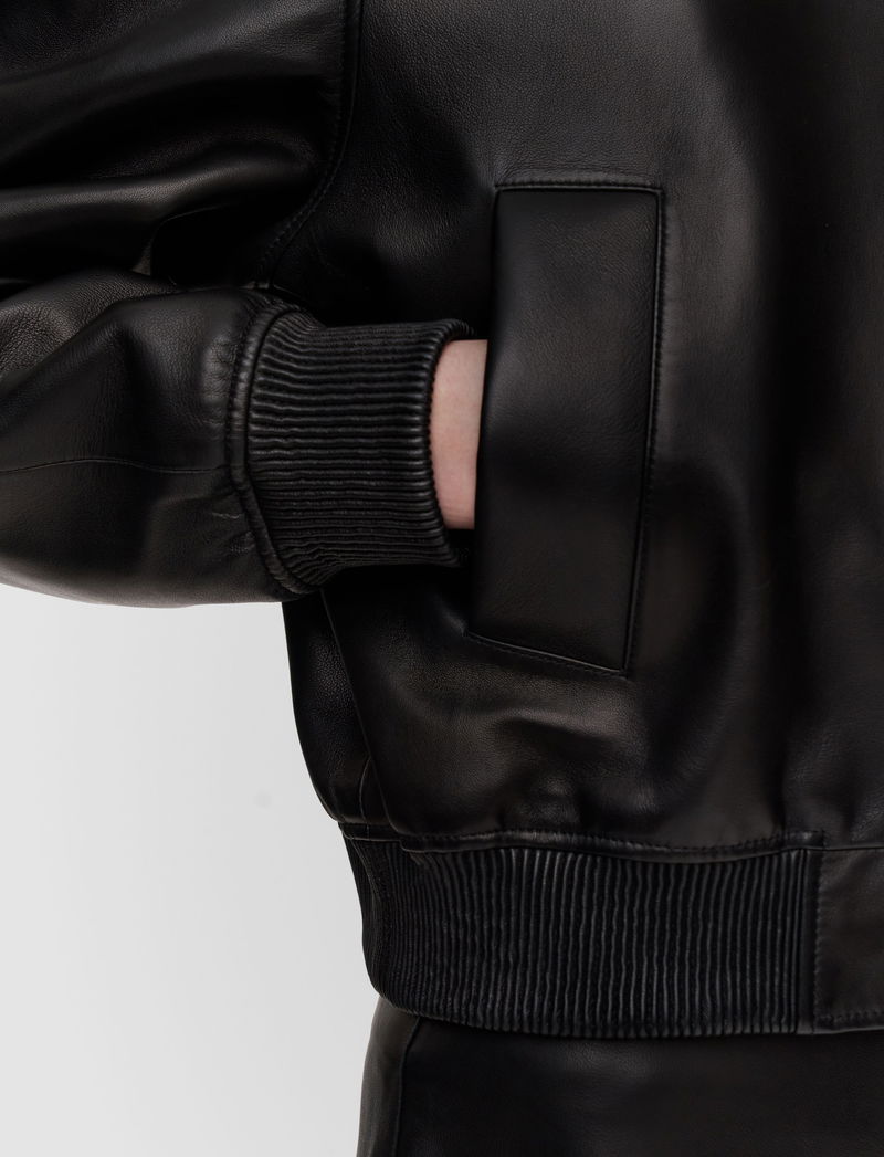The Quinn Soft Nappa Leather Bomber jacket is a relaxed fit style, crafted from supple nappa leather for exceptional comfort and softness.