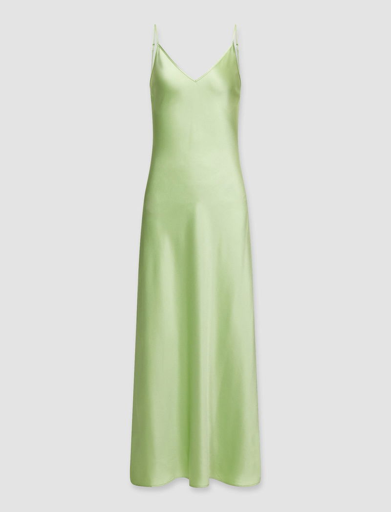 The Silk Satin Clea Dress is a classic, mid-length slip dress crafted from a luxurious silk. This fluid piece is lightly lined, features a V neck, adjustable straps, and is comprised of a satin weave which gives it a smooth, shiny and rich finish. For an effortless look that welcomes layering, this timeless piece can be worn any occasion.