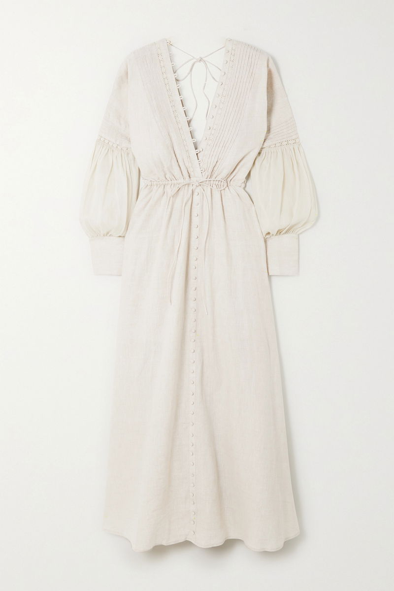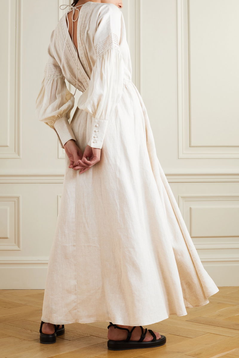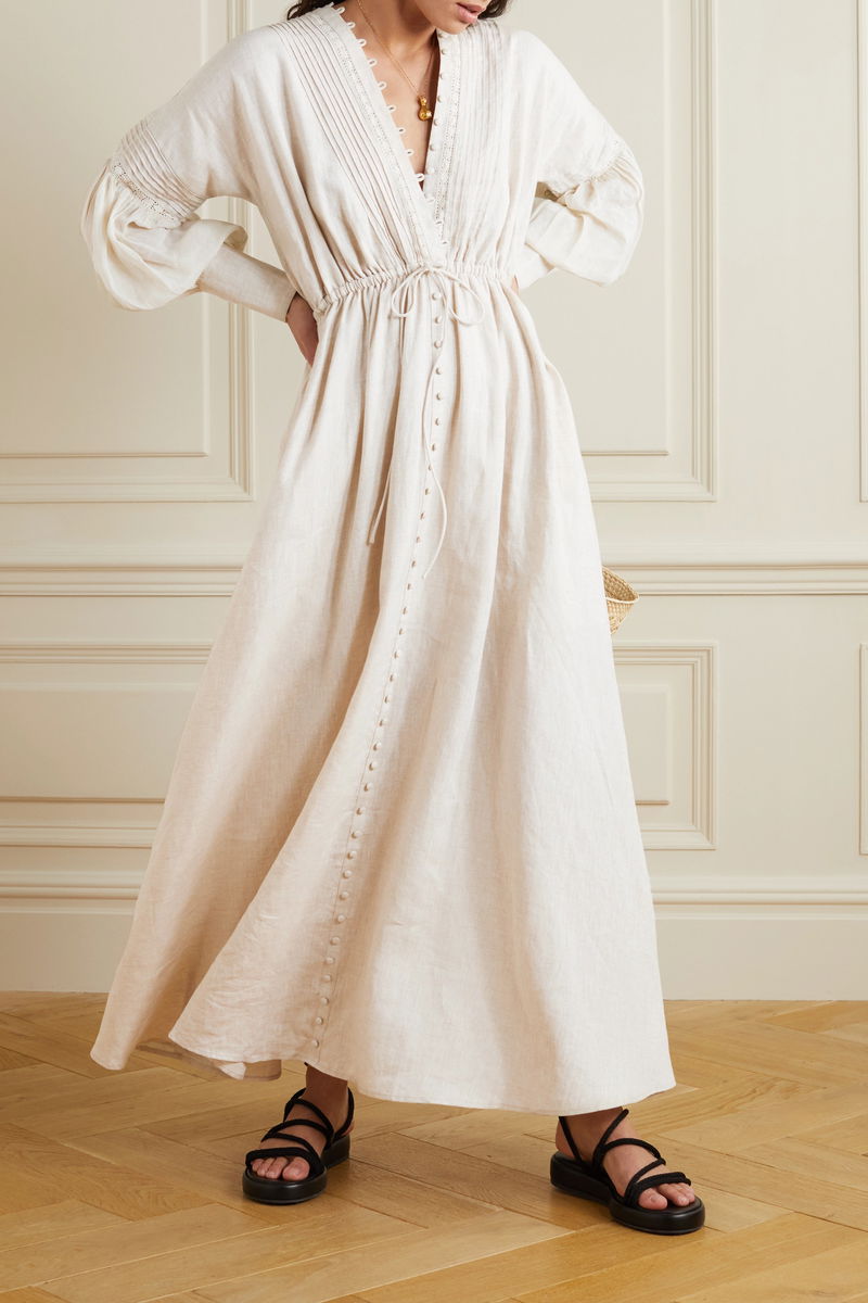 Joslin's romantic and effortless pieces are created to transcend seasons, so you'll treasure styles like this 'Melinda 2.0' maxi dress for years to come. It's made from naturally breathable, undyed linen and detailed with lace trims and pintucks along the plunging neckline and billowing sleeves. Style it with chunky sandals.