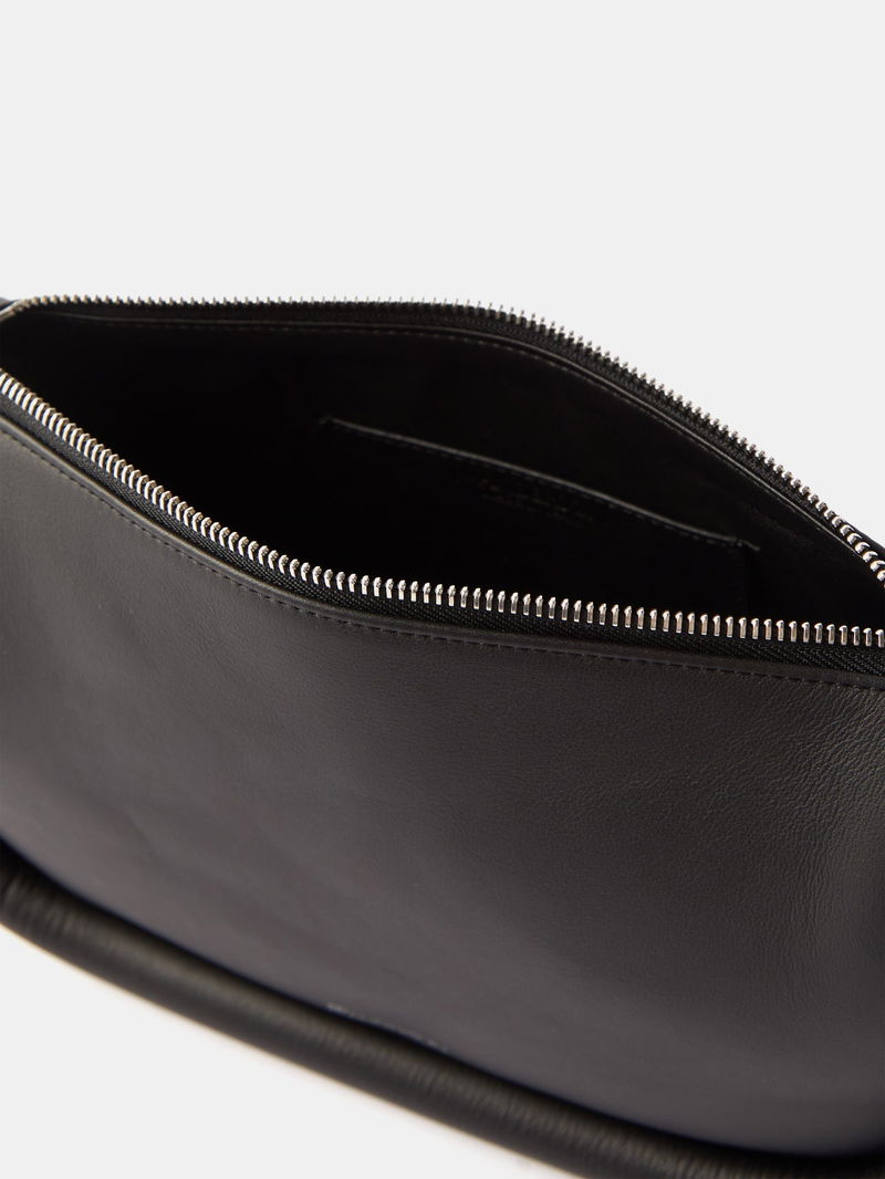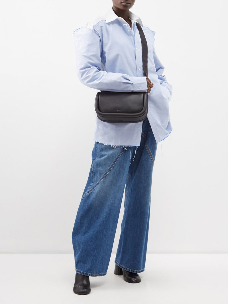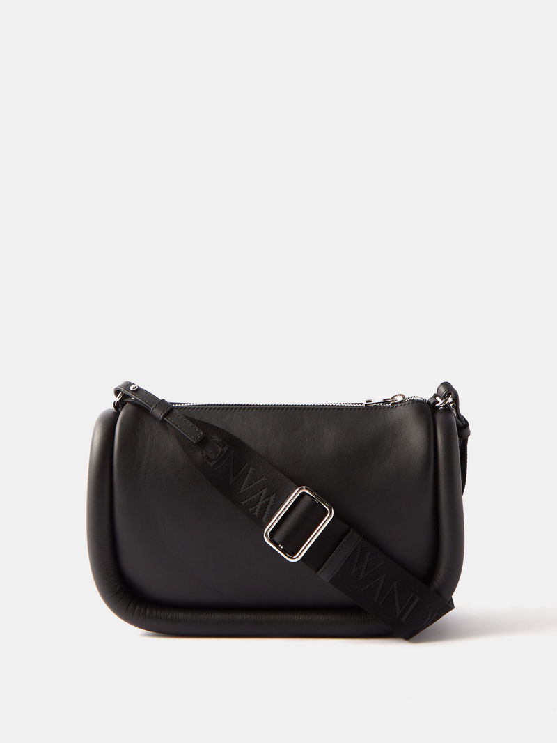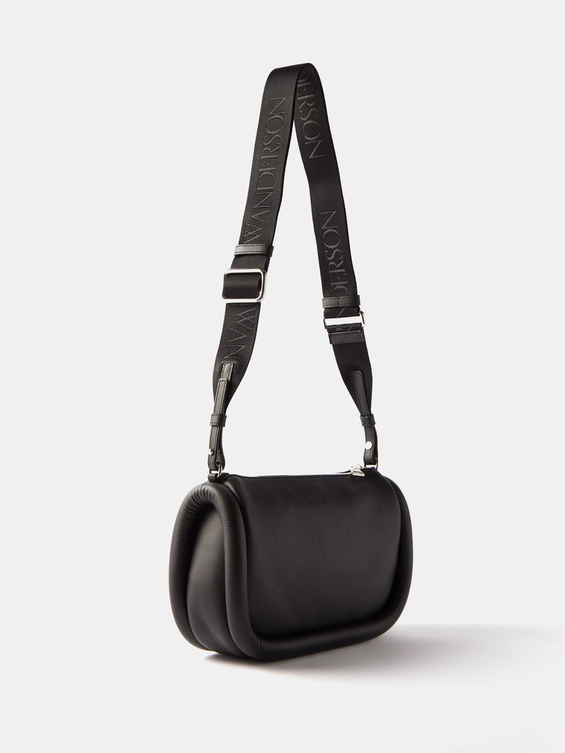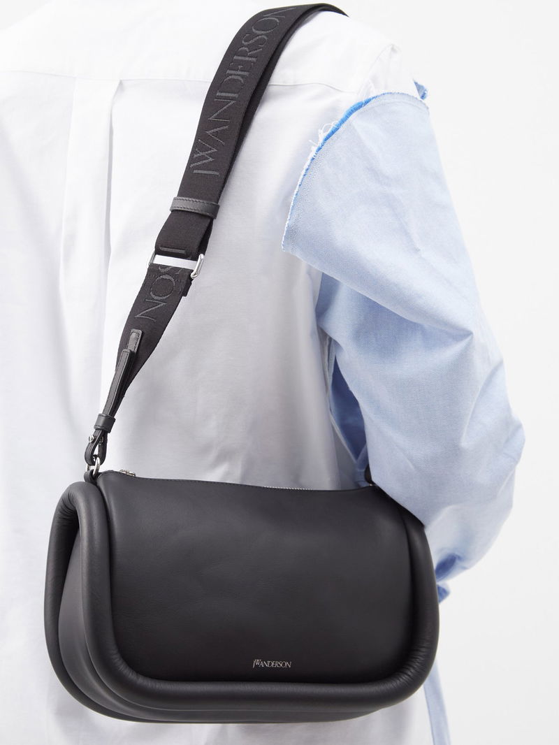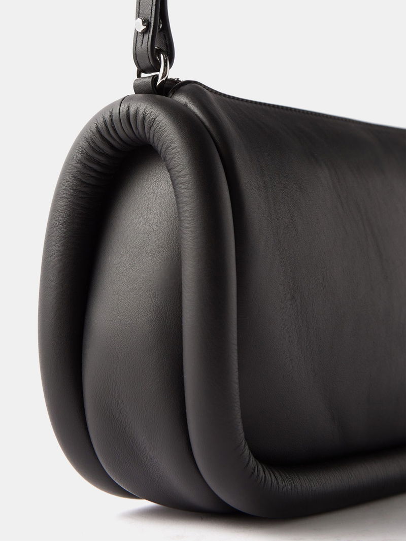 Debuted for SS22, JW Anderson's Bumper baguette bag is reworked in black grained leather, shaped with rounded tubular borders and a wide logo-jacquard strap.