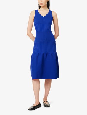 JW Anderson’s penchant for drapery is spotlighted through this navy midi dress, framed by asymmetric cape sleeves. It’s crafted from cupro – a brushed silk-like fabric that’s famed for its fluidity – with a lightly gathered round neck accented by hammered gold hardware, which can also be seen nipping in the waist before the skirt falls to an undulating handkerchief hem.