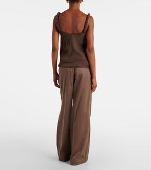 JW Anderson’s navy top is crafted from textured velvet that’s contrasted by exaggerated black satin cuffs. Topped with a point collar, this loose style is detailed with a trending zip-fastening neckline that features a leather trim at the circular pull.