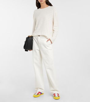 JW Anderson's white trainers are shaped to a high-top silhouette that's reminiscent of vintage basketball styles. They're crafted from panels of smooth and grained leather stitched over canvas, then set on a chunky rubber sole featuring a debossed logo.
