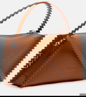 JW Anderson’s summertime tote is shaped to a spacious silhouette that’s suspended from two brown leather top handles. Woven from raffia in tonal burgundy and sand shades, this basket style is boldly appliquéd with the label’s anchor logo at the front.