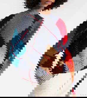 Stripes in an earthy palette of orange, grey, black and white imbue JW Anderson’s sweater with a definitive 1960s air – note how it’s enhanced by the oversized zip pull at the stand neck. It’s finely knitted for a smooth finish, then accented with extra-long sleeves that pool nonchalantly at the wrist.