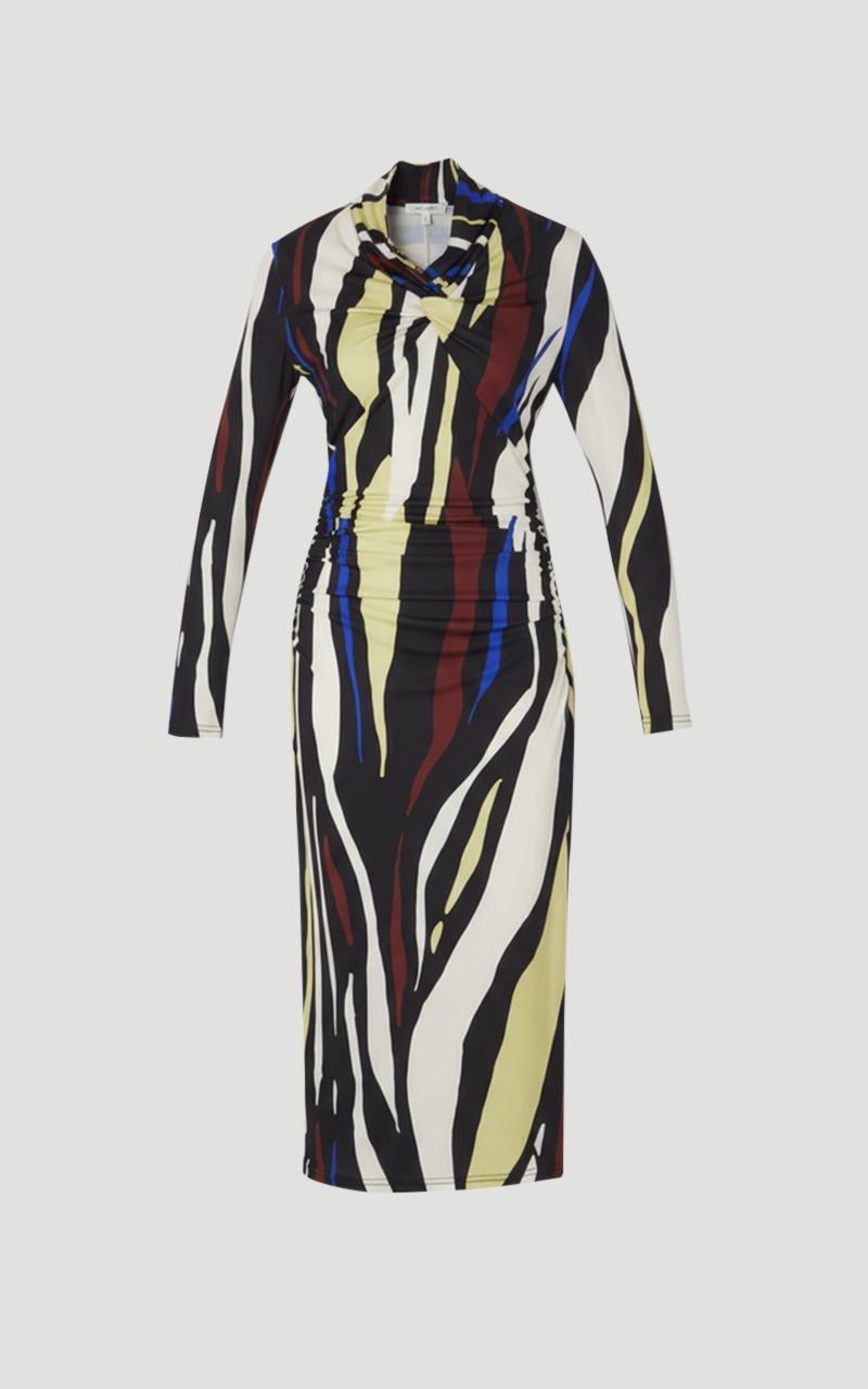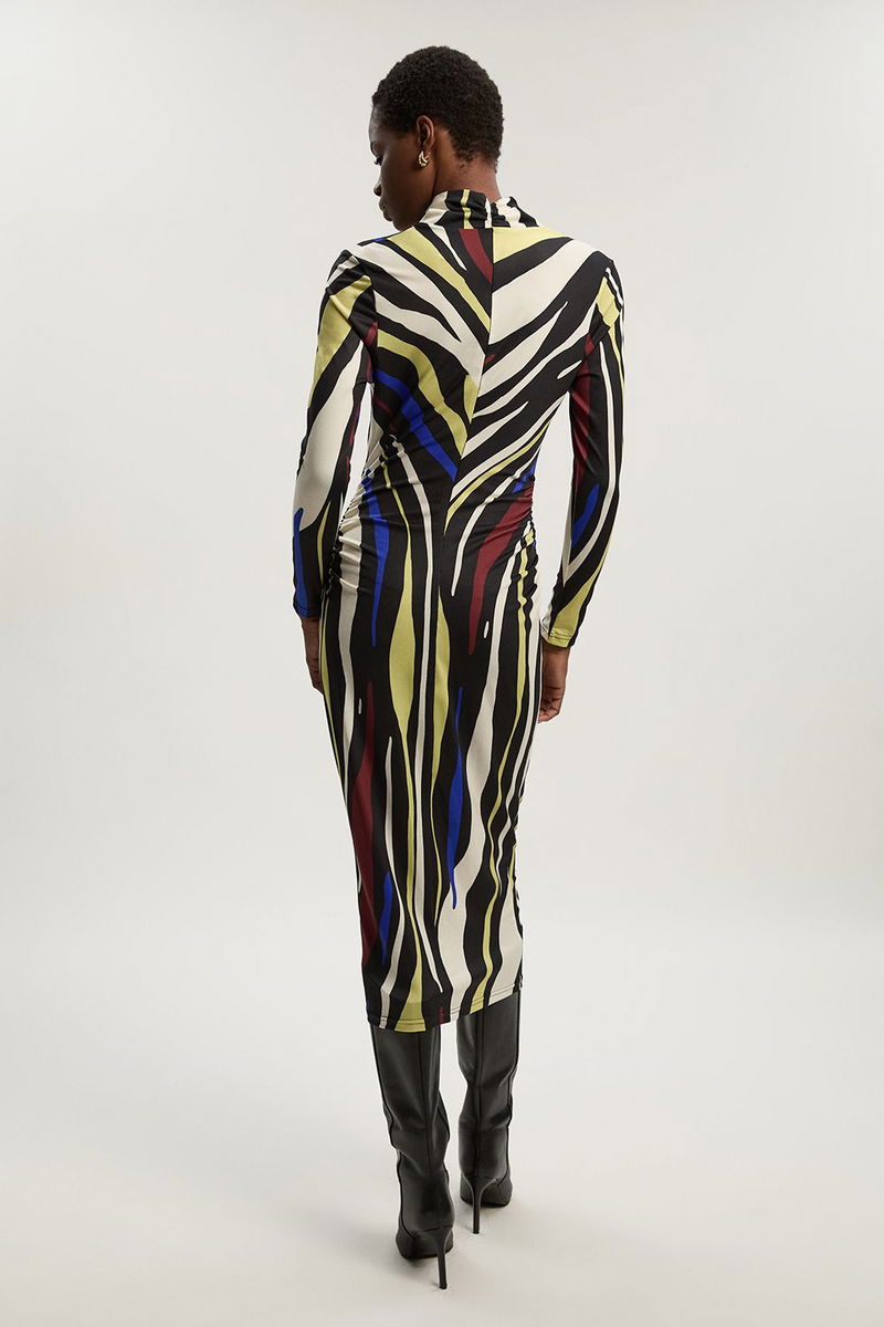 Abstract Zebra Print Ruched Detail High Neck Long Sleeve Crepe Midi Dress