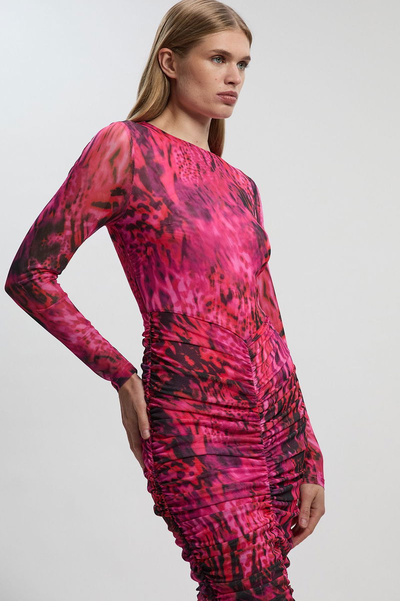 Animal Print Mesh Ruched Maxi Dress