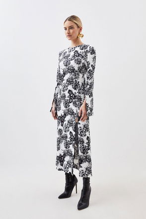 The printed dress, now with extra polish. Finessing your 9-9 wardrobe, this midi drapes effortlessly across the body thanks to its lightweight semi-sheer fabric. It’s been topped off with a flattering v-neck, pintuck-detail front, cuffed sleeves and flared A-line skirt.