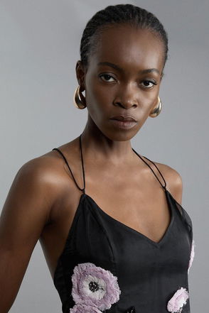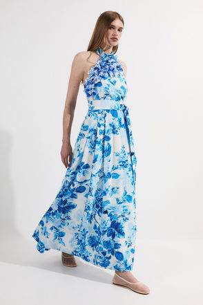 Applique Organdie Buttoned Halter Neck Maxi Dress.
