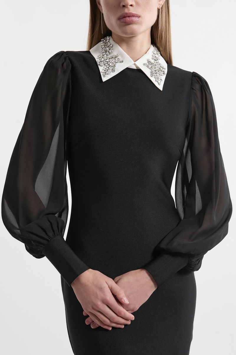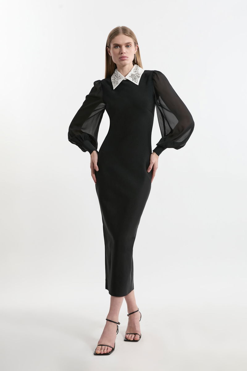 Bandage Collared Knitted Midi Dress With Sheer Sleeve